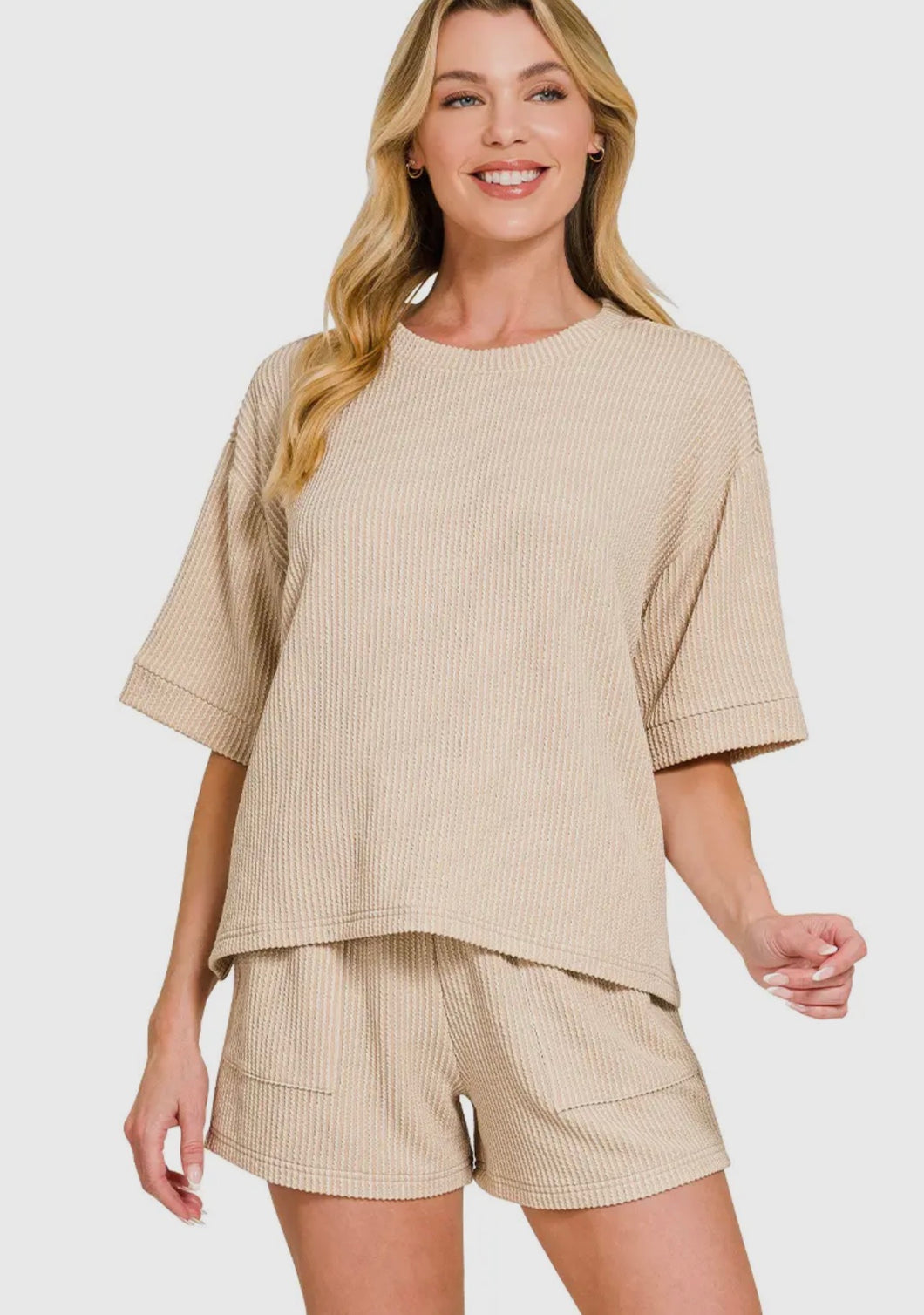 Effortless comfort meets laid-back style with this navy corded shorts set. The generous-fit round-neck tee pairs perfectly with functional shorts featuring a practical pocket—ideal for casual days when you want to look put-together without trying too hard. The breathable polyester-rayon blend with a touch of spandex keeps you comfortable and moves with you. Perfect for weekend hangs, errands, or just kicking back in style.