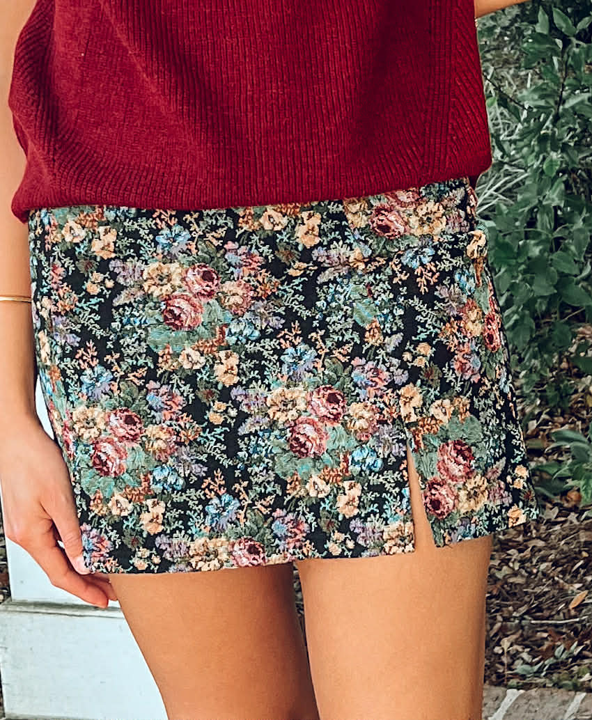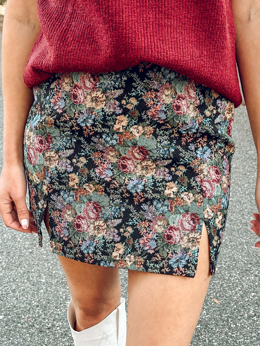 Slip into this stunning Floral Holiday Mini Skirt, crafted from luxurious Jacquard fabric with a delicate floral pattern. Its side invisible zipper ensures a seamless fit, while the front slit adds a touch of allure. Perfect for the holiday season, this skirt will make you feel elegant and confident.