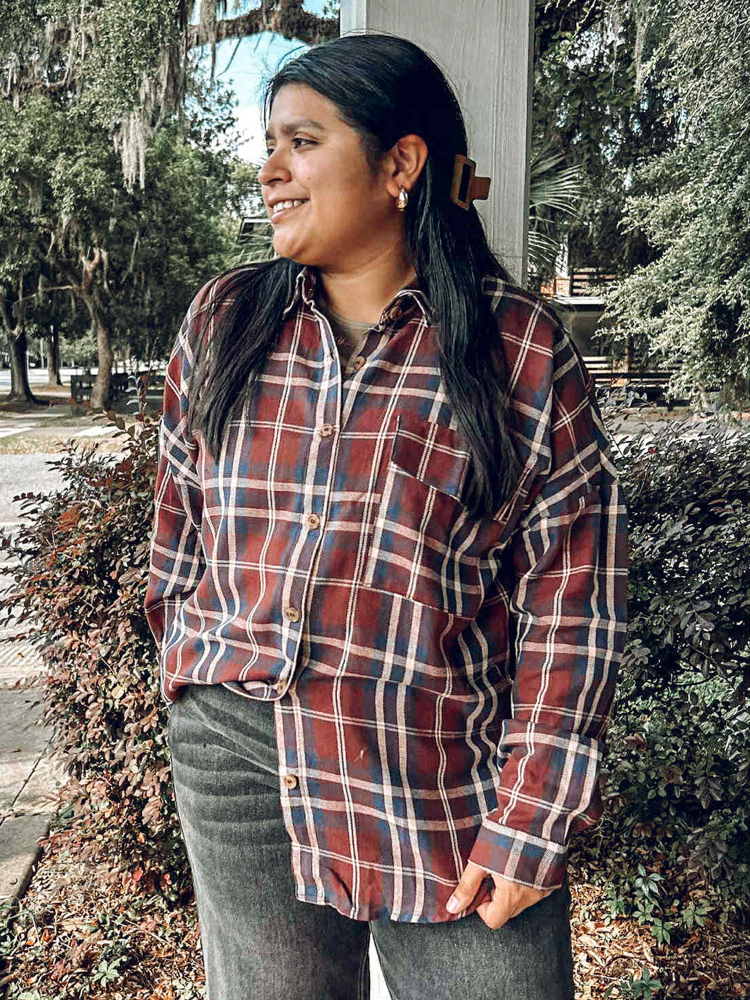 This burgundy plaid button-down top blends classic style with casual comfort. Crafted from 100% cotton, its breathable woven fabric feels soft against your skin. The drop shoulder and long sleeves add a relaxed fit, while the collared neckline and button closure offer timeless appeal. A flap pocket detail adds practicality and subtle interest. Perfect for layering or wearing alone, this unlined shirt promises both style and ease for your everyday wardrobe.