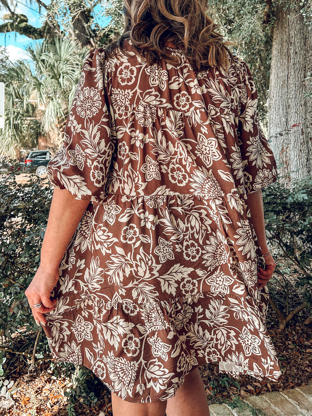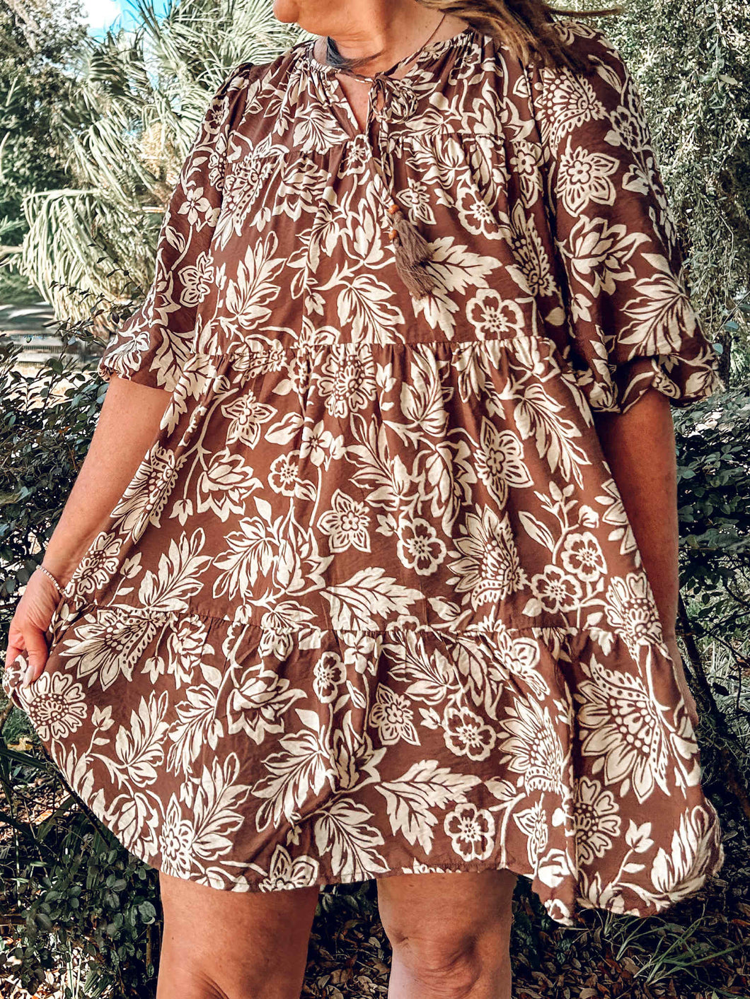Embrace effortless bohemian style with this charming printed half-sleeve baby doll mini dress. The flattering front tie detail adds a playful touch while the flowing silhouette creates movement and dimension. Crafted from a luxurious rayon and nylon blend, this dress drapes beautifully against your skin for all-day comfort. Perfect for casual outings, weekend adventures, or layered styling, this versatile piece brings boho-chic flair to any wardrobe. At 35½ inches, it's the ideal length for showing off your favorite footwear.