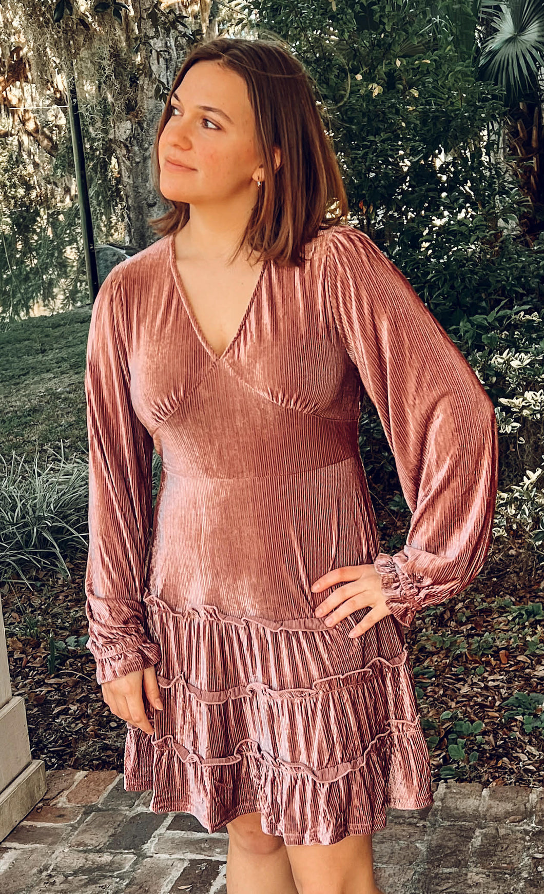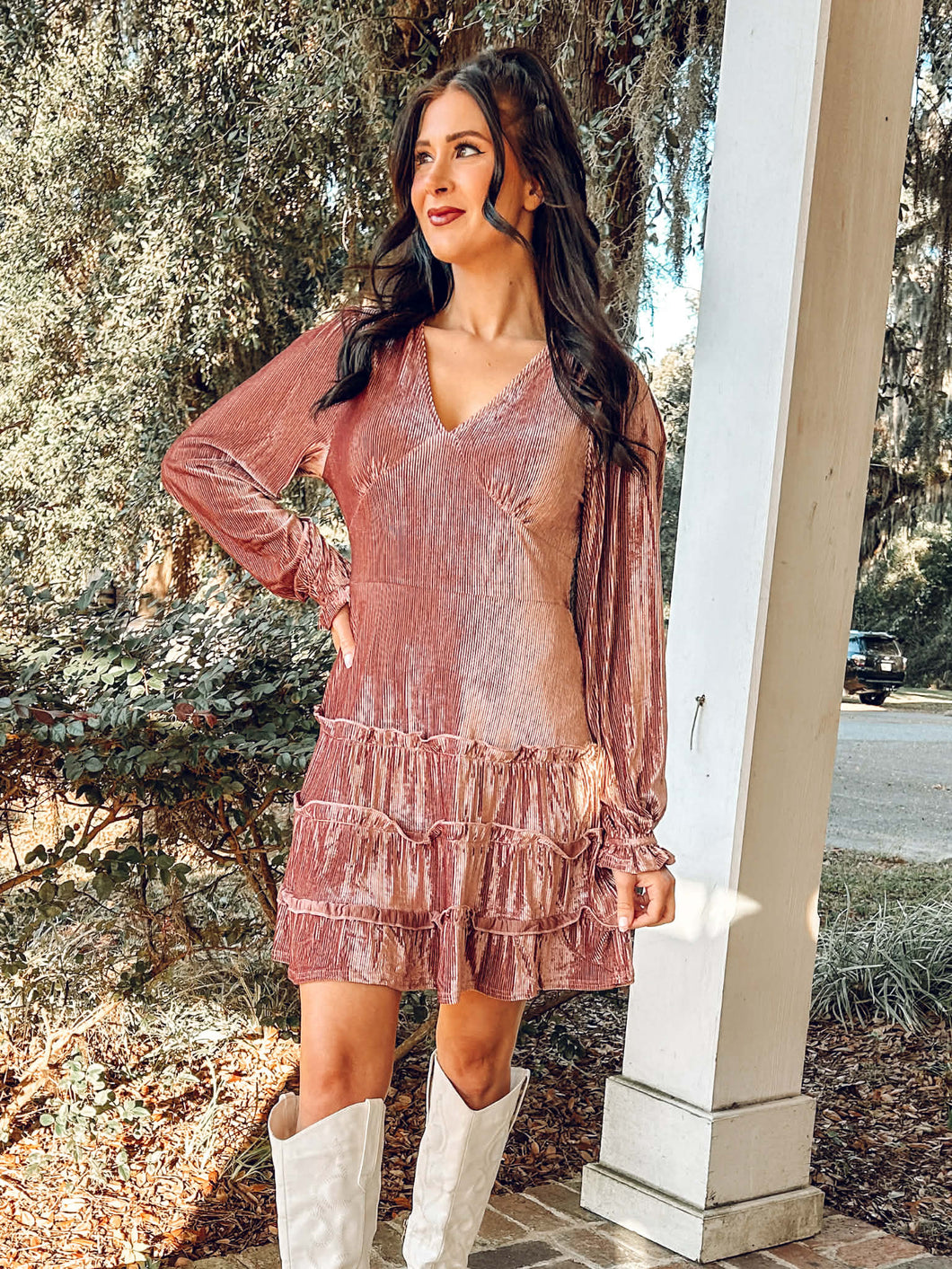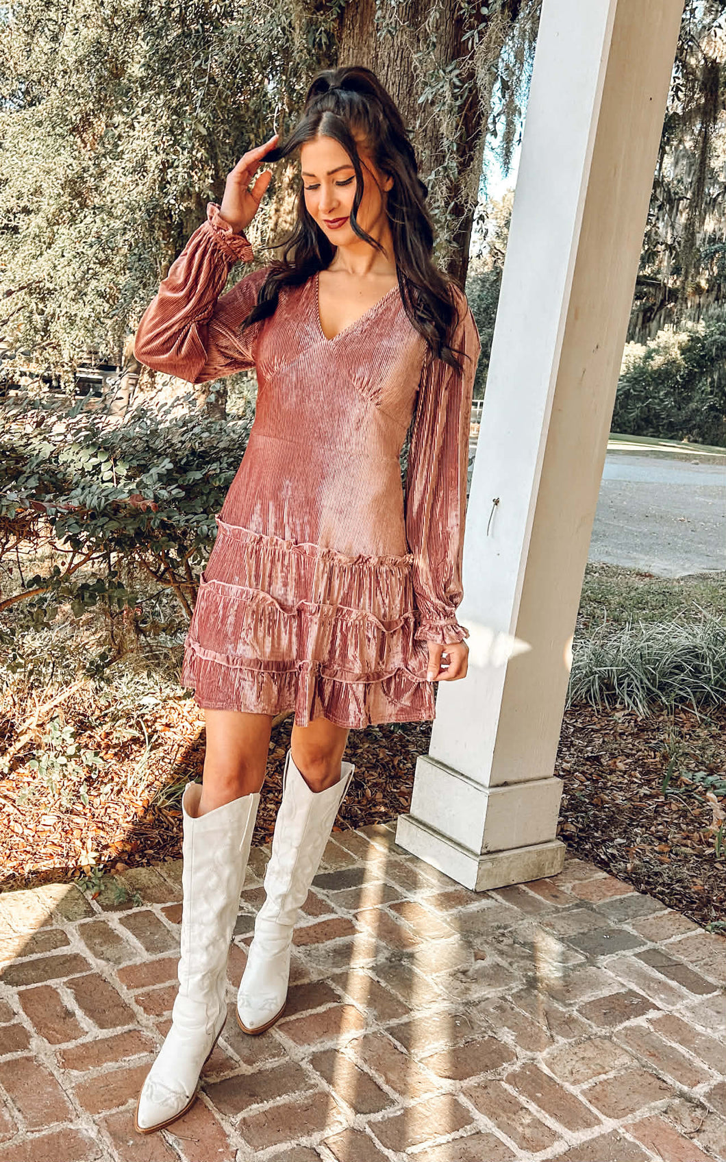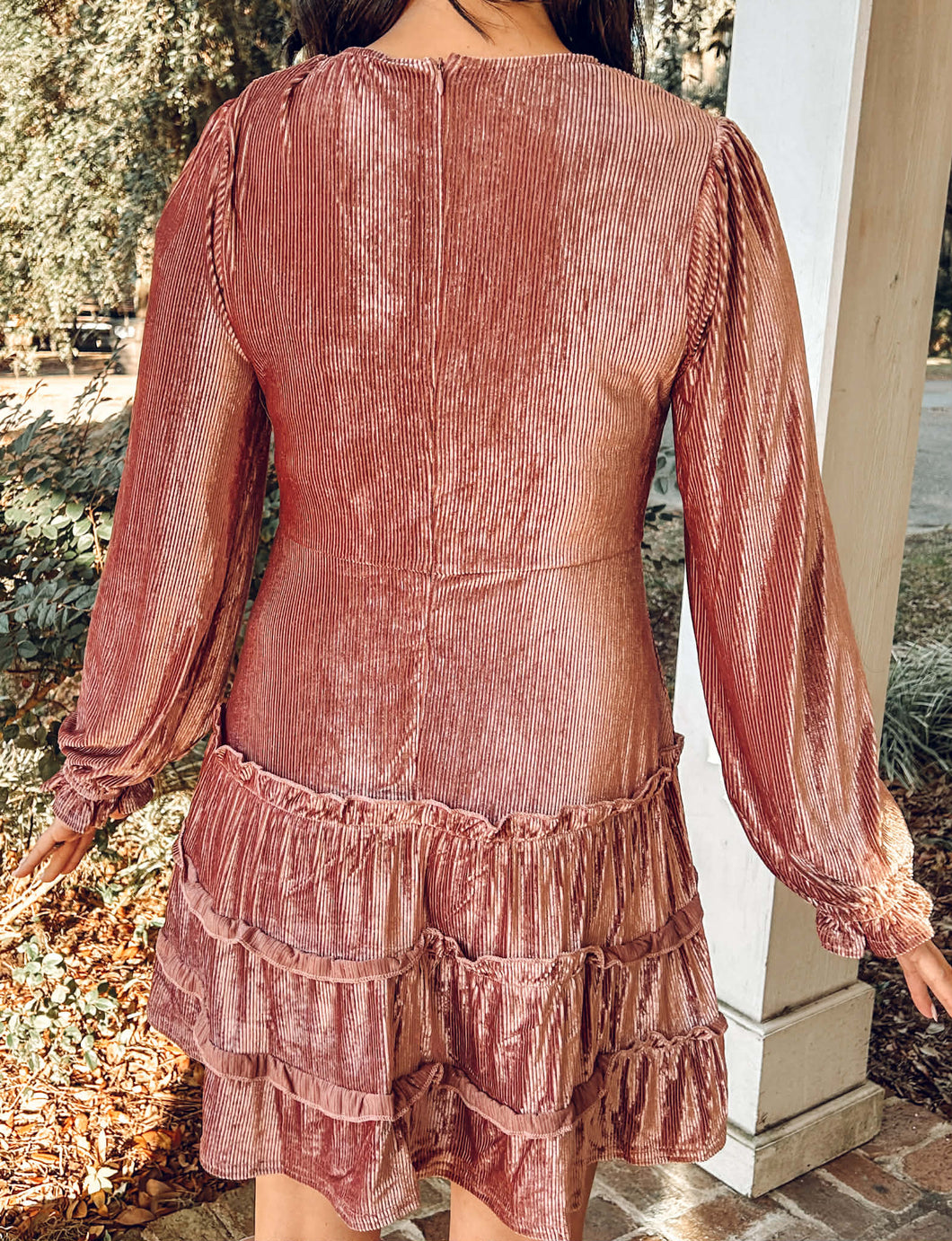 Elevate your holiday wardrobe with the Noel Velvet Dress in luxurious mauve. This stunning mini features a flattering deep V-neckline and sumptuous textured velvet that catches the light beautifully. Long sleeves provide elegant coverage while ruffled tiered layers add movement and dimension to every step. The convenient back zipper ensures an effortless fit. Perfect for festive gatherings, date nights, or any occasion calling for sophisticated style. Make a memorable impression in this show-stopping piece.