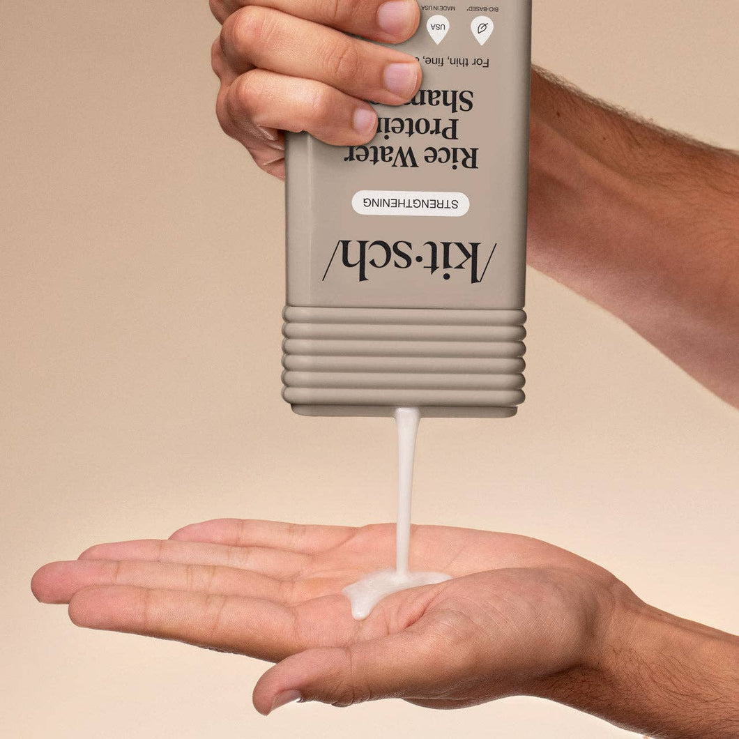 * Formulated with Rice Tein NPNF ® ️ clinically tested to instantly promote natural shine in 1 use, while boosting volume and healthy appearance in 5 uses.1 * Cleanses and strengthens thin, fine, & damaged hair Why You'll Love This: * Rice Tein NPNF ® helps fortify hair to prevent damage and promotes a healthy appearance1 * Rice Tein NPNF ® boosts shine in dull, dry hair * 88% Bio-based formula * Free of parabens, phthalates, silicones, SLS & SLES * Made in USA, cruelty-free, color-safe * Fully recyclable packaging and made with PCR (post-consumer recycled) material 1 All trademarked ingredients referenced under license; copy points reflect the supplier-approved claims. How To Use: * Wet hair thoroughly, then massage shampoo into the scalp to create a rich, bubbly lather. * Focus on the top, sides, and back of the scalp. * Continue massaging for 2 minutes to lift dirt and buildup. * Rinse thoroughly with warm water. * Follow with Kitsch Strengthening Rice Water Protein Conditione