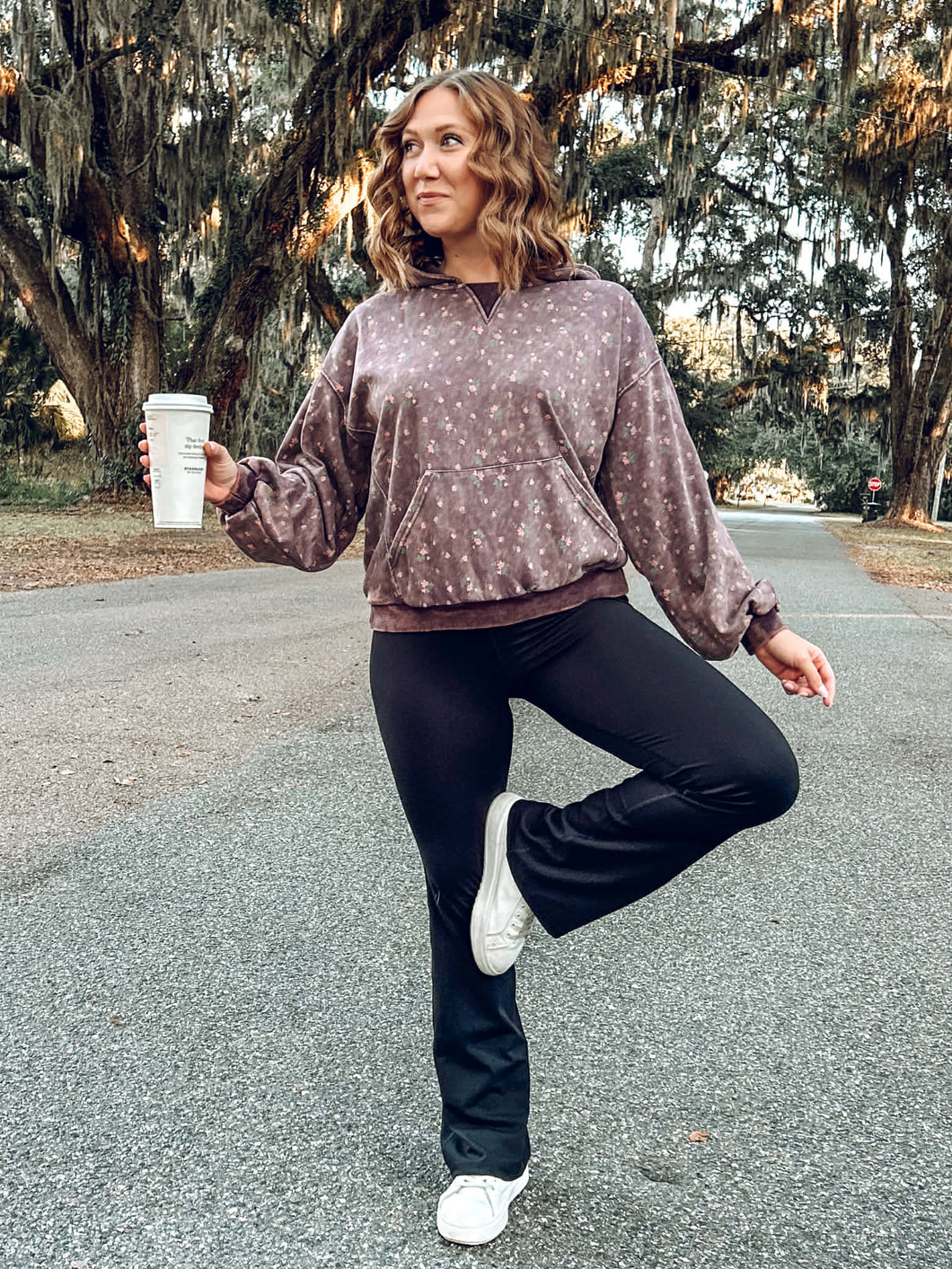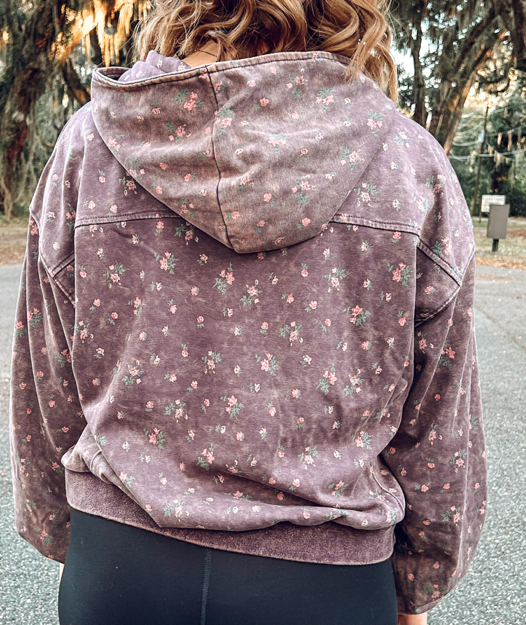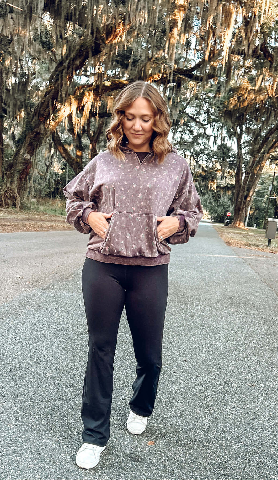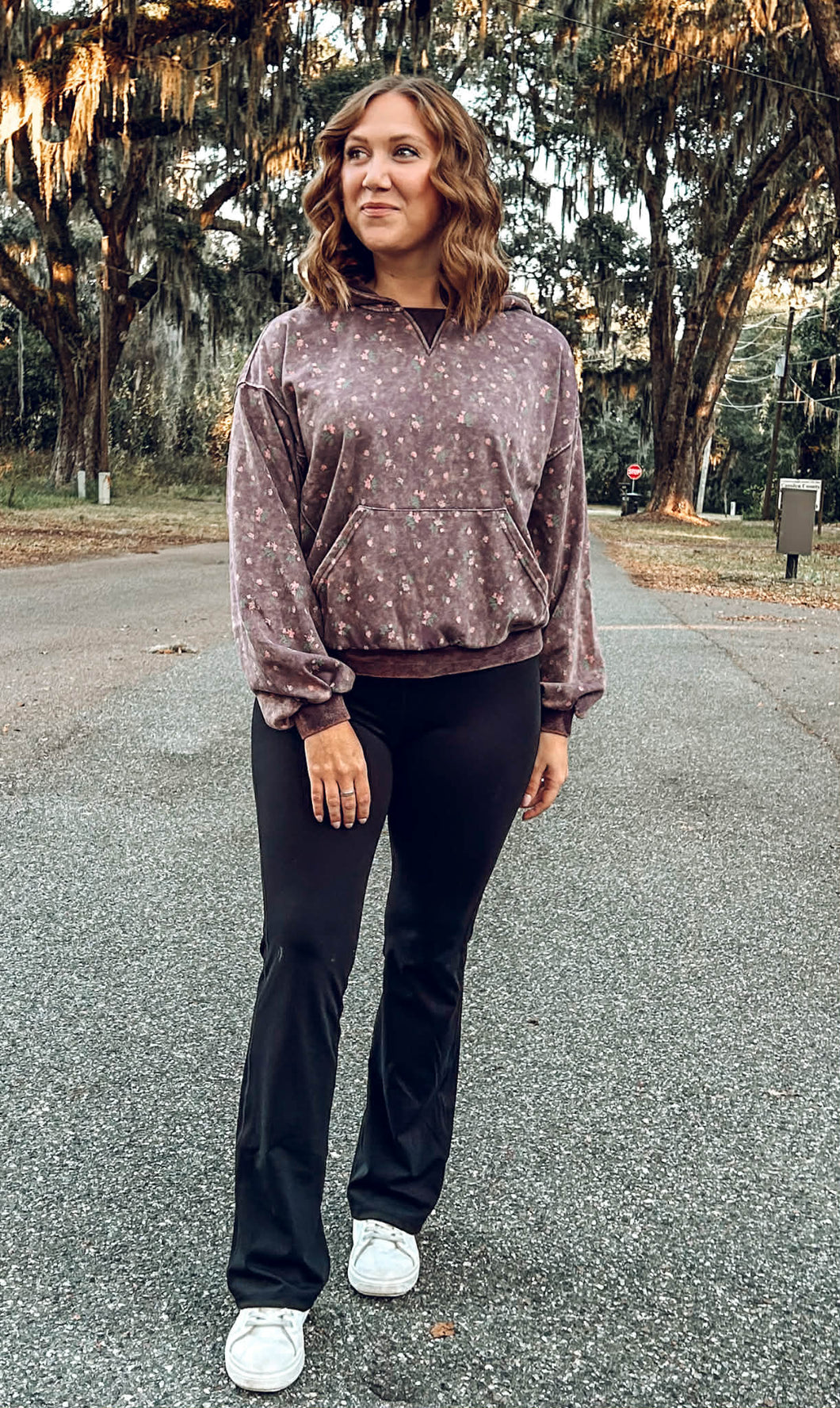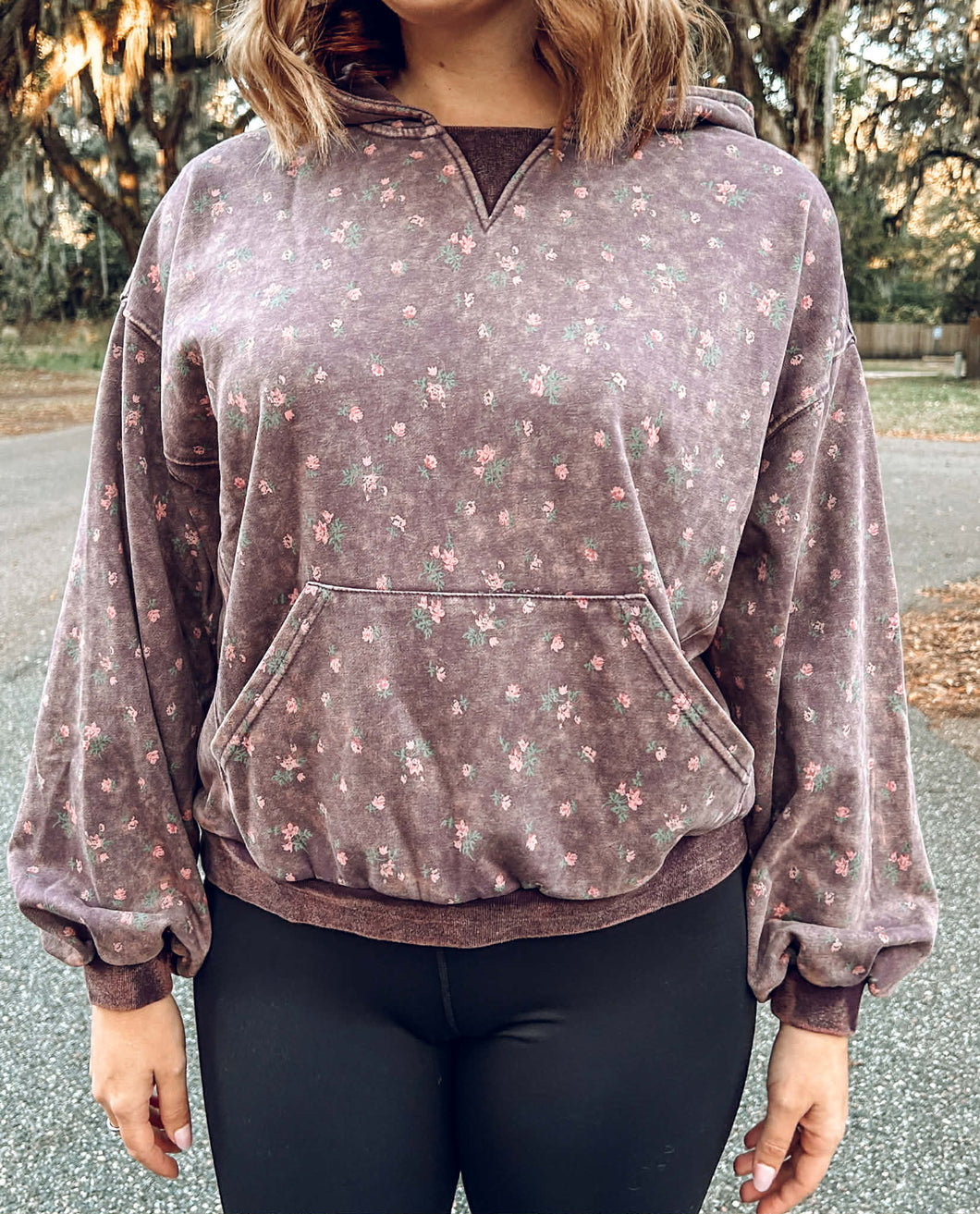 Bloom into comfort with this charming floral relaxed hoodie featuring a soft knit fabric that's perfect for cozy days. The playful plum hue showcases delicate floral prints while the relaxed fit keeps things effortlessly laid-back. Stay warm with long sleeves, a cozy hood, and a front kangaroo pocket ideal for your hands or essentials. Ribbed details at the cuffs and banded hem provide a polished finish that keeps everything in place. Whether you're lounging at home or running errands, this hoodie blends style and comfort in one delightful package.