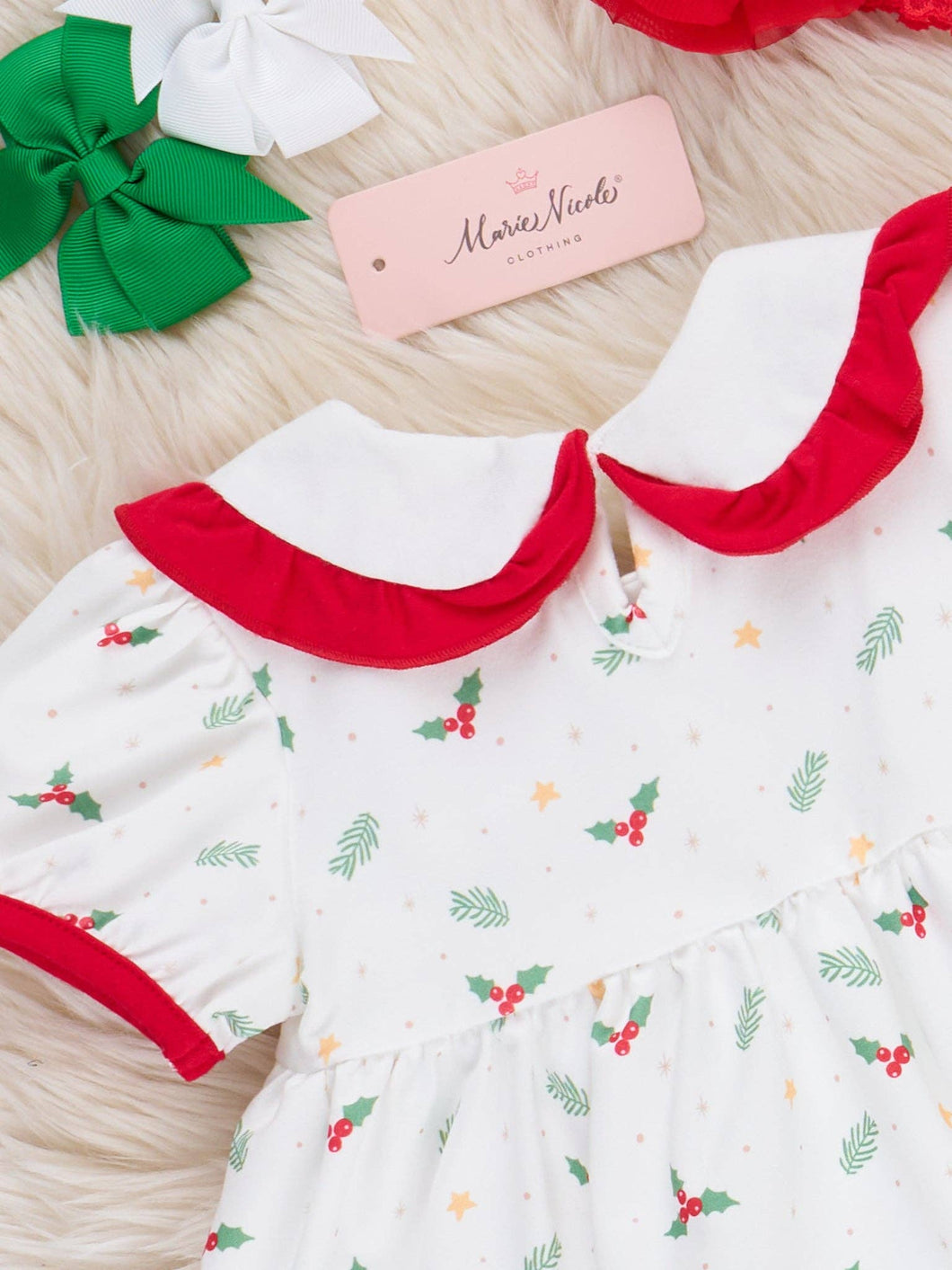 The Holly Jolly Santa Embroidered Bloomers Outfit by Marie Nicole Clothing features a whimsical holiday-inspired design with a sweet Santa embroidery and playful accents. Crafted from soft, comfortable fabric, this charming set includes a classic top and matching bloomers—perfect for festive gatherings and creating joyful memories all season long. * Fits true to size. * Top: 95% Polyester / 5% Spandex * Combo: 97% Cotton / 3% Spandex * Bottoms: 97% Cotton / 3% Spandex * Accessories sold separately. * Import.
