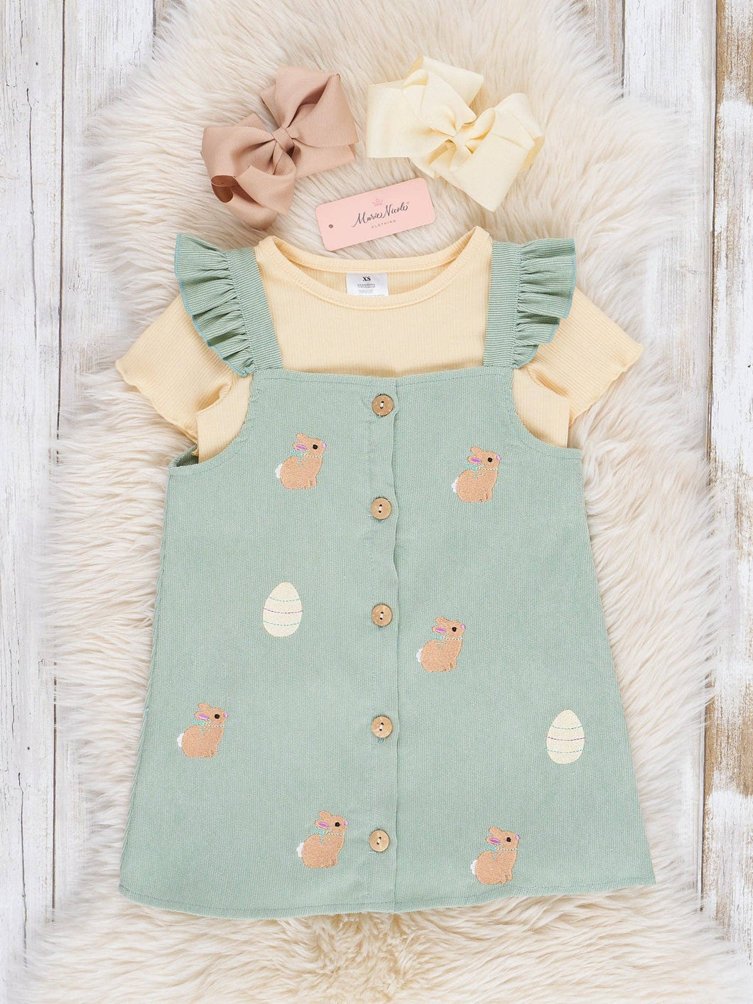 Hop into spring with this playful Sage Bunnies & Carrots Skirtall Set! Featuring a cream ribbed top and a sage green corduroy skirtall, complete with charming embroidered bunnies and carrots. Perfect for Easter festivities, this girls jumper is brought to you by Marie Nicole Clothing