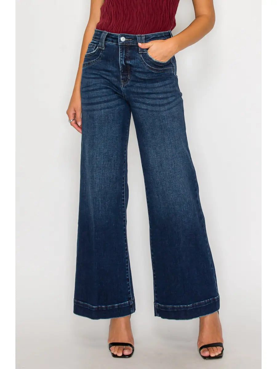 Designed for a polished yet relaxed look, this high-rise A-wide leg jean blends structure with comfort. The dark stone wash adds depth and versatility, making it easy to dress up or down. Finished with a wide leg opening, it offers a flattering, elongating effect that transitions seamlessly from day to night
