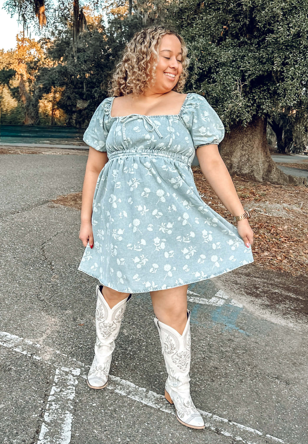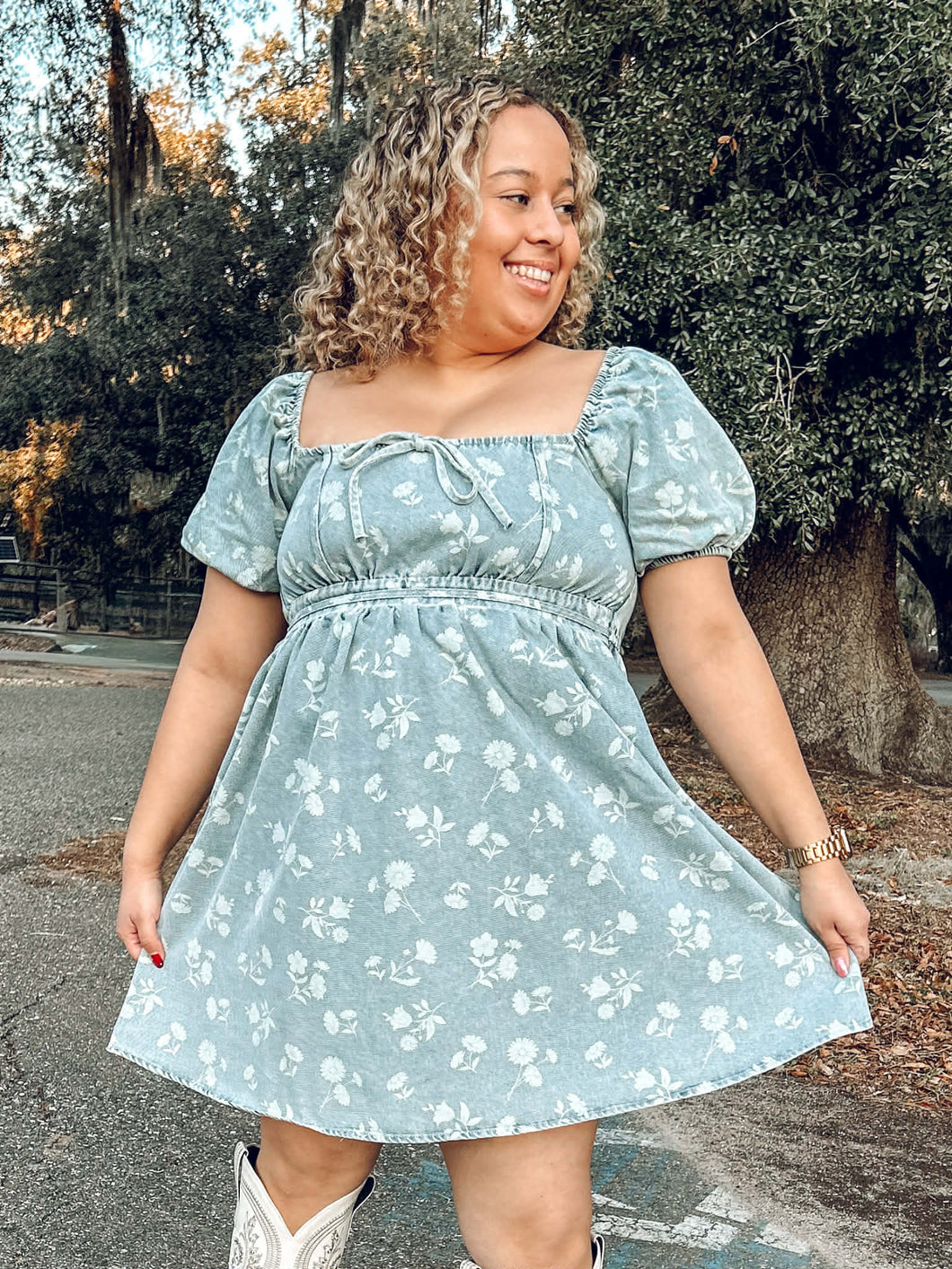 Embrace effortless charm in this Blu Floral Denim Dress—a playful mini featuring a scooped neckline and darling puff sleeves that frame the shoulders just right. The front tie detail adds a flirty touch, while back smocking creates flattering texture and movement. A flouncy mini skirt keeps things fun and breezy. Crafted from a soft cotton-blend fabric with a washed floral denim pattern, each piece showcases unique color variations that make it truly one-of-a-kind. Unlined for a relaxed, summery feel. Perfect for casual outings or weekend adventures.
