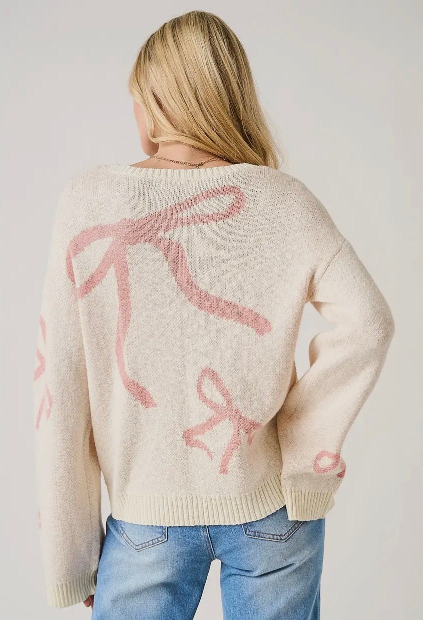 Embrace your softer side in this charming knit sweater, featuring delicate coquette ribbon bows scattered across the front, back, and sleeves. Crafted from a cozy cotton-acrylic blend with ribbed detailing for structure, this piece boasts a relaxed silhouette with generously wide long sleeves and a classic crew neckline. Perfect for layering through spring and fall, it's the effortless way to add a touch of feminine flair to any outfit.