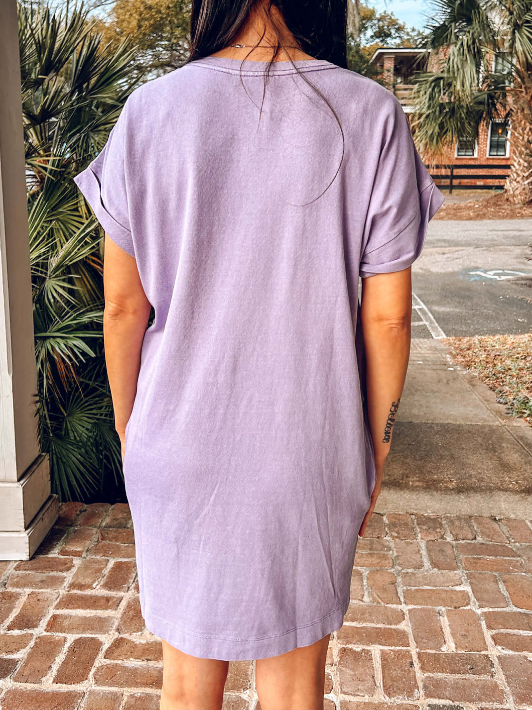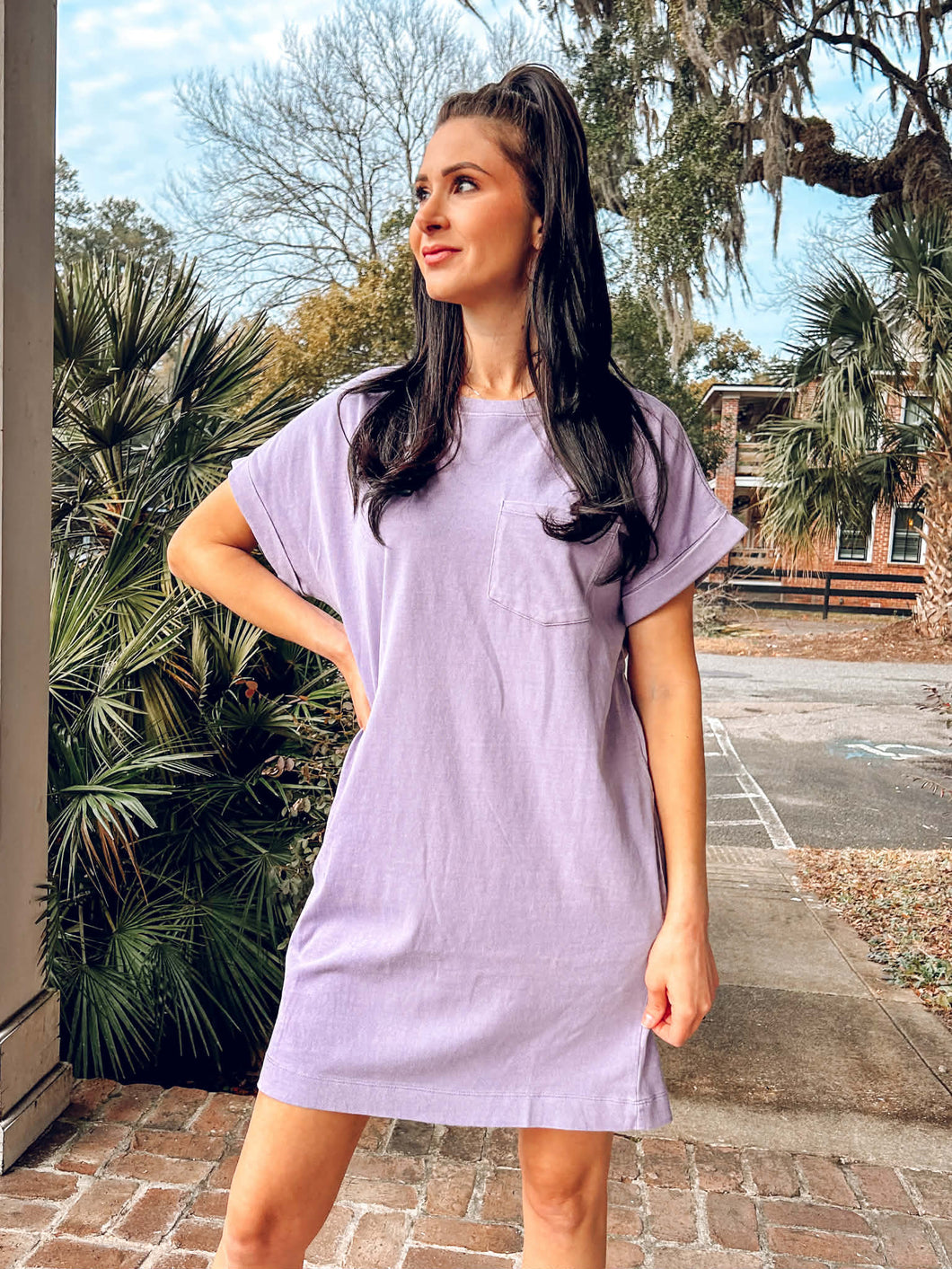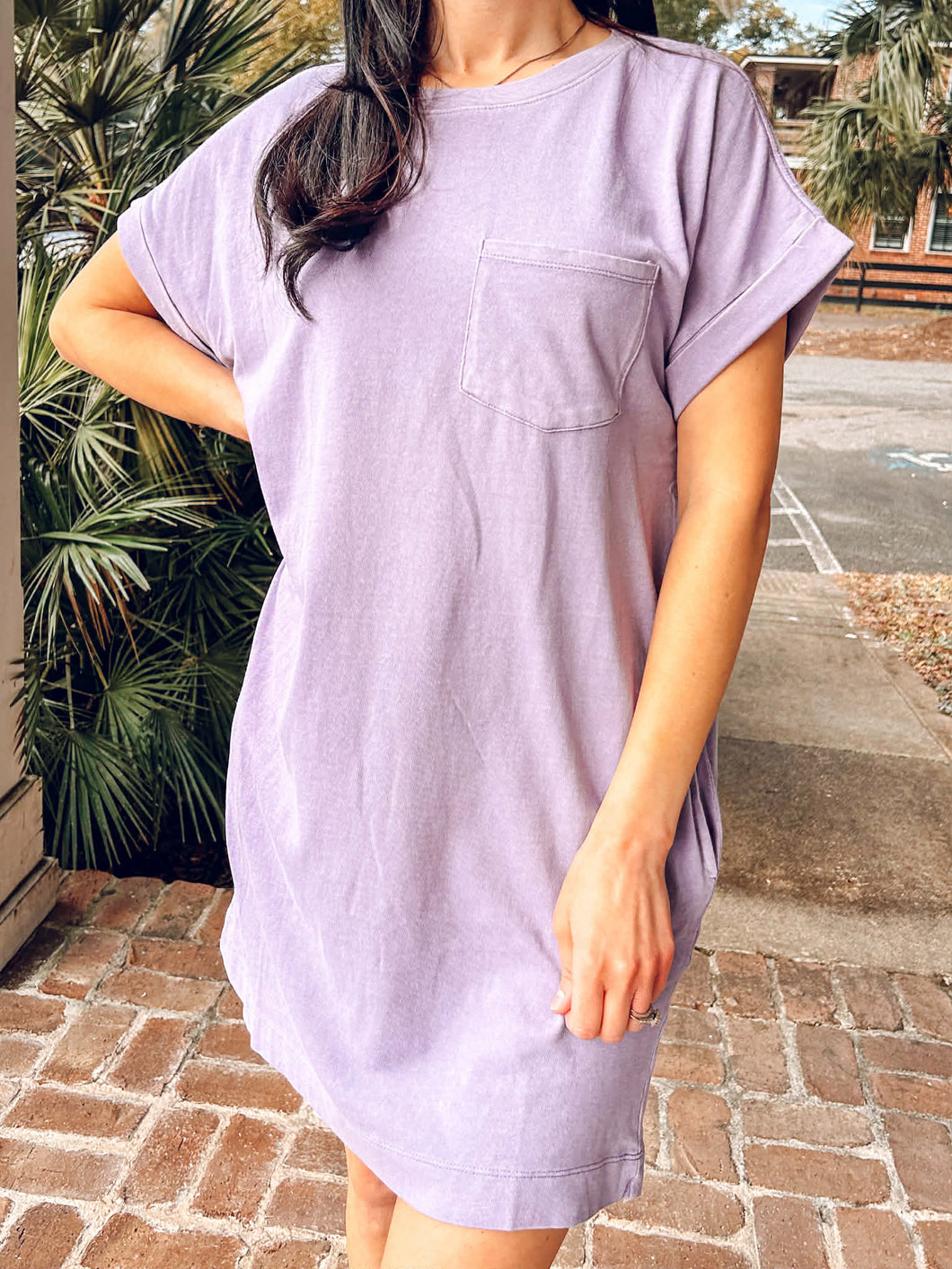 Throw on this effortless cotton tee dress and embrace pure comfort. The relaxed crewneck silhouette pairs perfectly with sneakers for those laid-back weekend vibes, while cuffed short sleeves and a front patch pocket add charming detail. Hidden side-seam pockets keep your essentials close without breaking the vibe. Crafted from soft cotton with a rich pigment dye finish, this dusty purple staple transitions seamlessly from errands to casual hangouts. Simple, comfortable, and endlessly wearable.