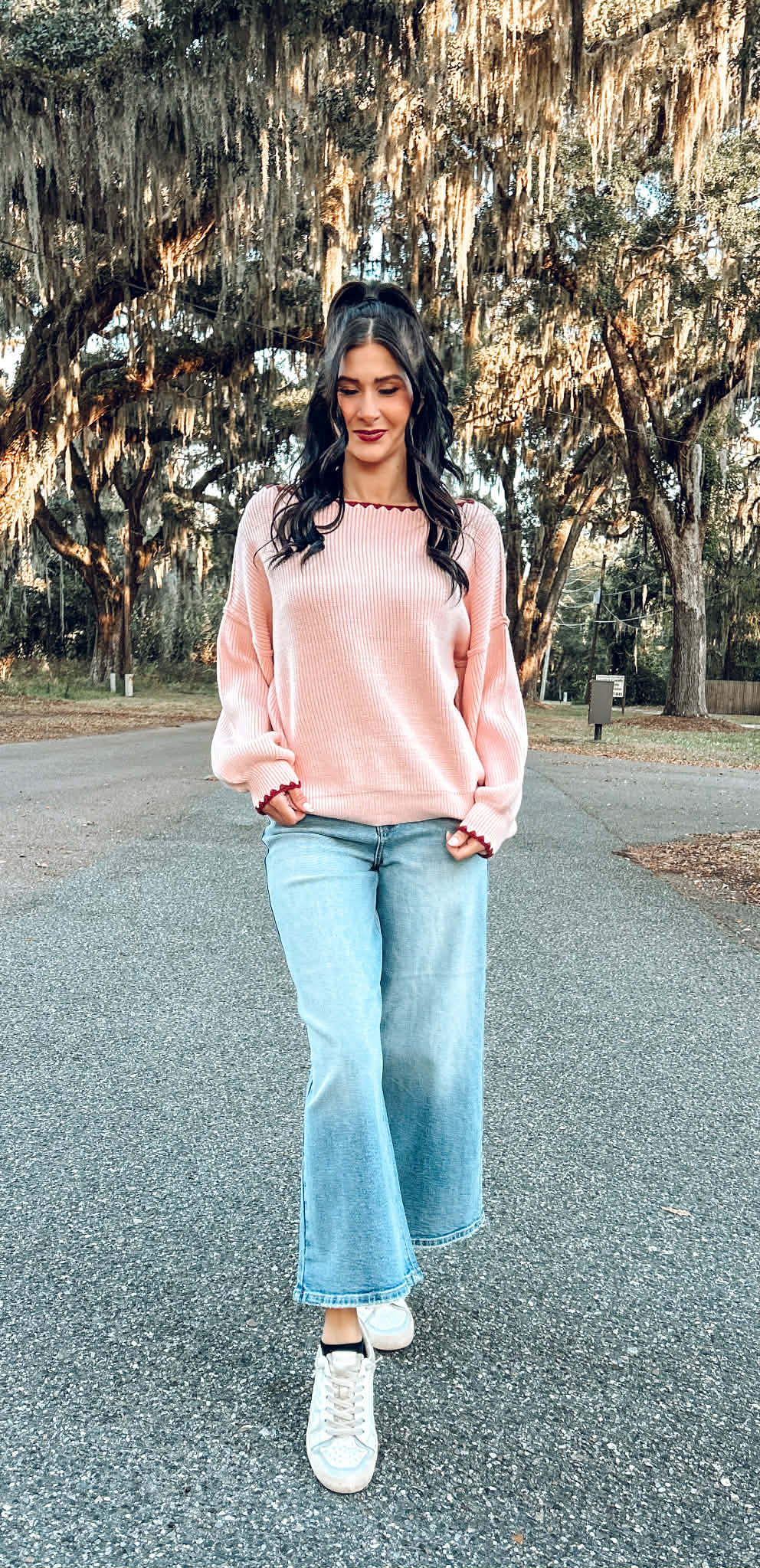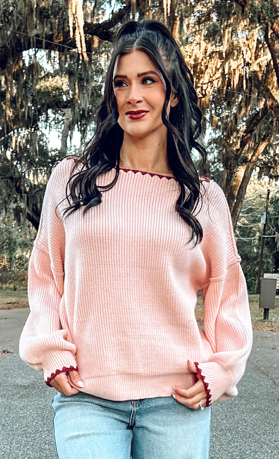 Elevate your everyday style with this effortlessly chic sweater. The striking boat neckline and fitted cuffs feature eye-catching contrast triangle stitching that adds visual interest and dimension. Dramatic puff sleeves with a drop shoulder silhouette create a modern, fashion-forward look, while the slouchy, relaxed bodice ensures all-day comfort. A banded ribbed hem keeps everything polished and in place. Perfect for layering or wearing solo, this piece transitions seamlessly from casual weekends to elevated casual outings.