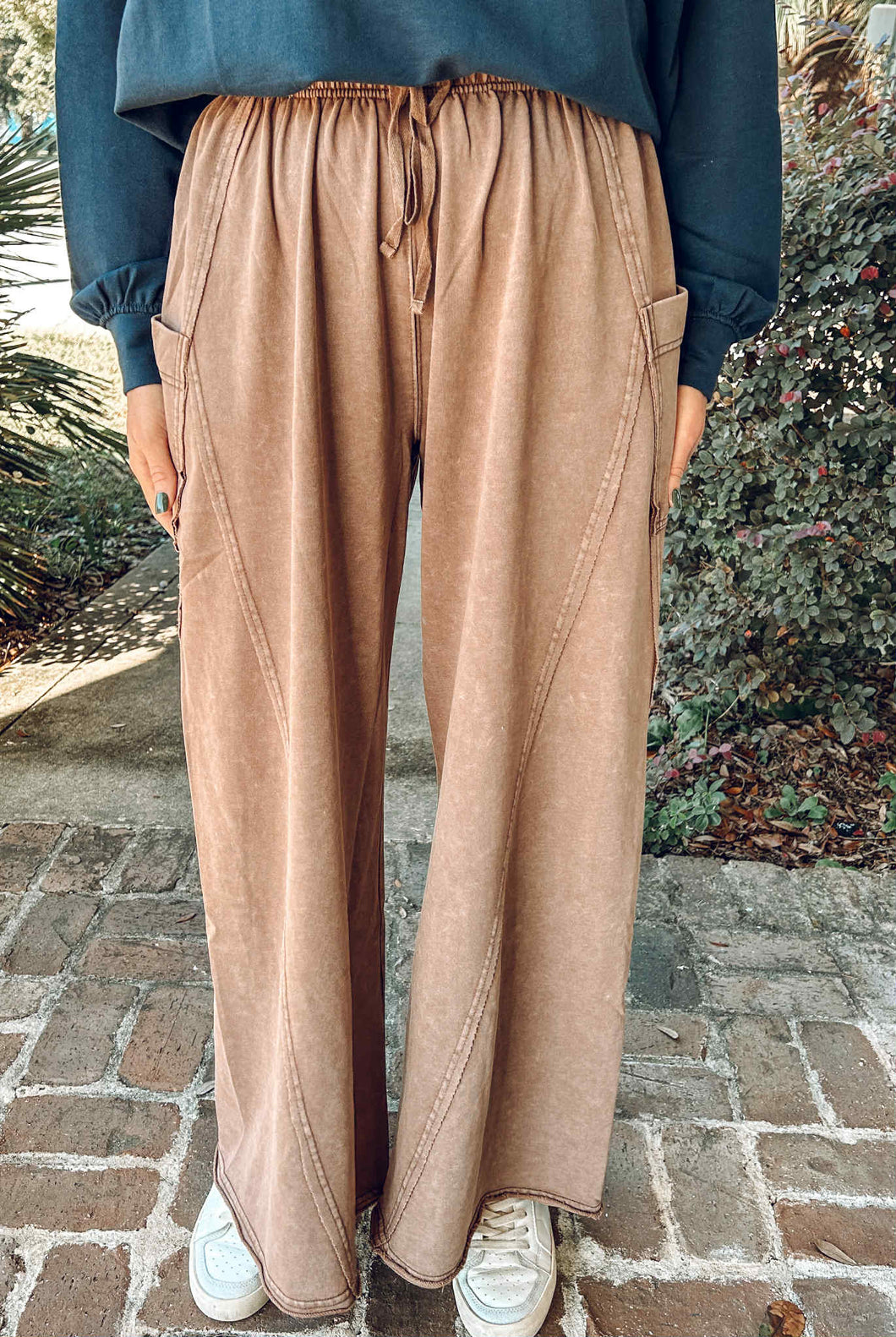 Effortlessly chic meets comfort in these Dropped Pocket Washed Pants. Crafted from soft cotton French terry with a mineral wash finish, they feature an elastic waist with drawstring tie and distinctive dropped side pockets for modern style. Pleated waistband detailing, raw-cut edges, and seam accents throughout add sophisticated dimension. The relaxed wide-leg silhouette and full length create a flattering, laid-back look perfect for elevated casual wear. Slip them on and feel the difference quality construction makes.