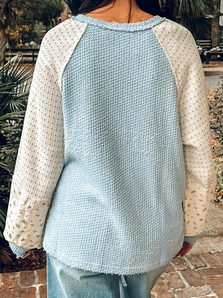 Bring effortless style to your everyday rotation with this charming colorblock knit top. Featuring playful raglan sleeves and a textured knit fabric, it's the perfect piece for mixing and matching with your favorite bottoms. The light blue hue pairs beautifully with neutrals or bold accents, making it a versatile wardrobe essential. Comfortable, casual, and undeniably cuteâthis top is ready for coffee dates, weekend errands, or just-because moments.