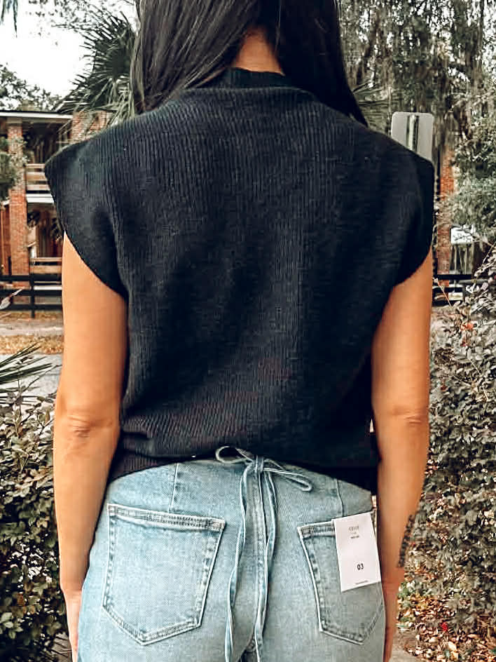 Elevate your style with our Black Vest! This Two Tone Ribbed Knit Sweater Vest adds a touch of sophistication to any outfit. The mock neck and sleeveless design give a modern twist. Stay warm and stylish this season!