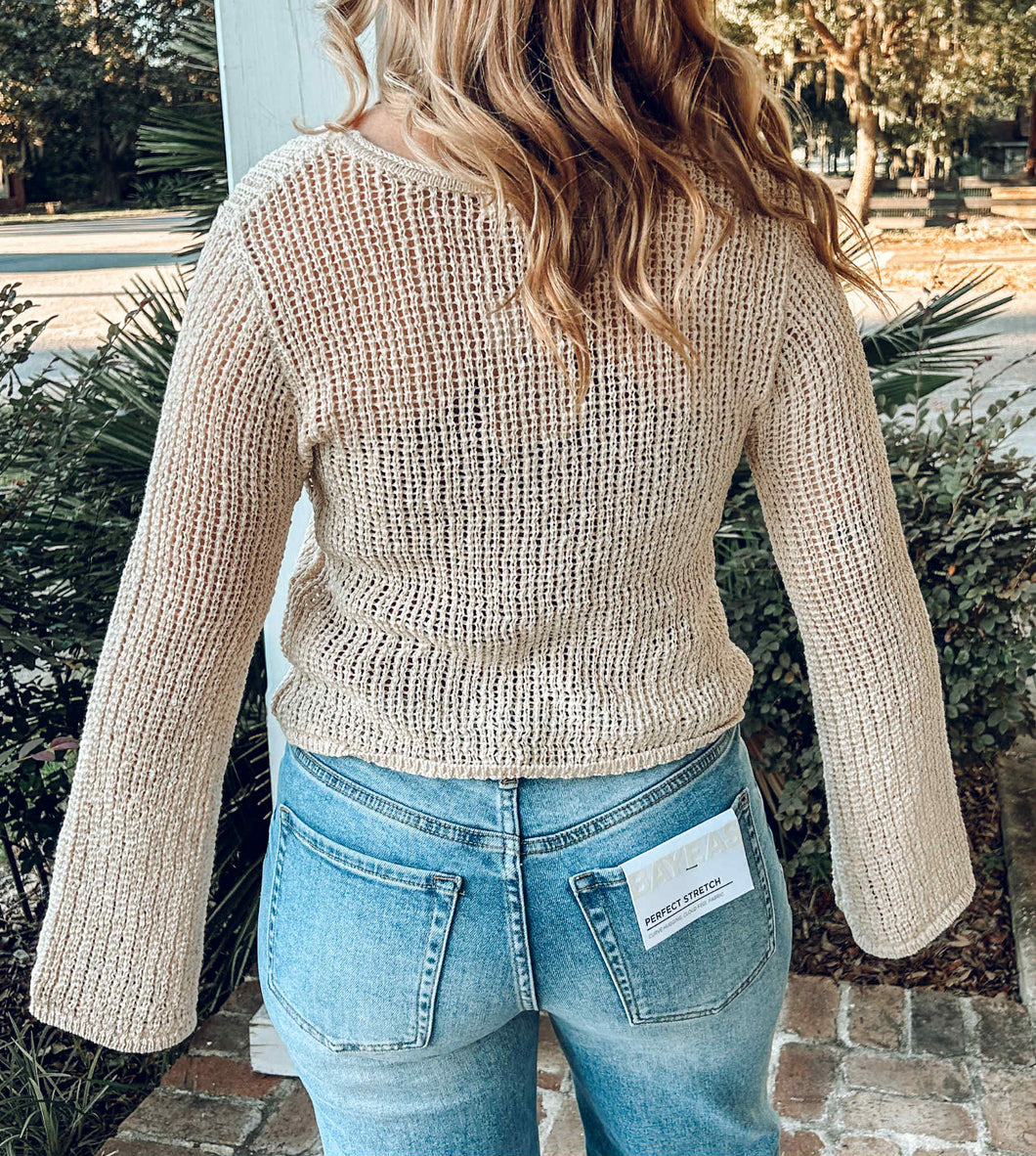 This cropped knit cardigan features stylish bell sleeves and an open-front design with button details, offering a perfect blend of comfort and chic. Its natural hue makes it versatile for layering over any outfit, adding a soft, cozy touch while flattering your silhouette. Ideal for transitional weather, it elevates casual looks with effortless ease.