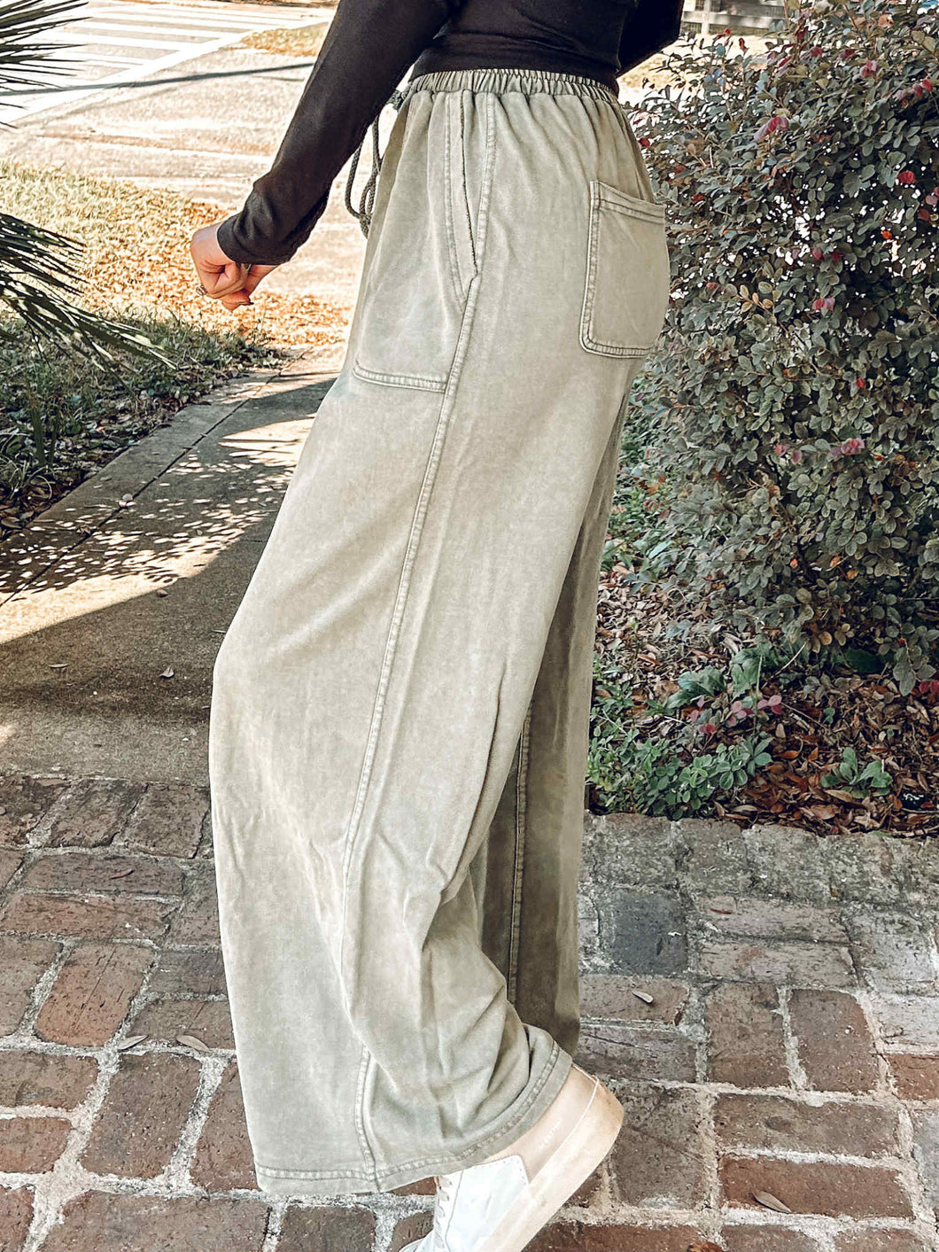 Effortless comfort meets laid-back style with these mineral-washed terry pants. Crafted from soft cotton French terry, they feature an elastic waist with drawstring tie for an adjustable fit, plus functional patch and back pockets for everyday convenience. The wide-leg silhouette and full-length cut create a relaxed, modern look, while subtle seaming details add visual interest. Perfect for lounging at home or running errands in style, these versatile olive pants are a wardrobe essential that works as hard as you do.