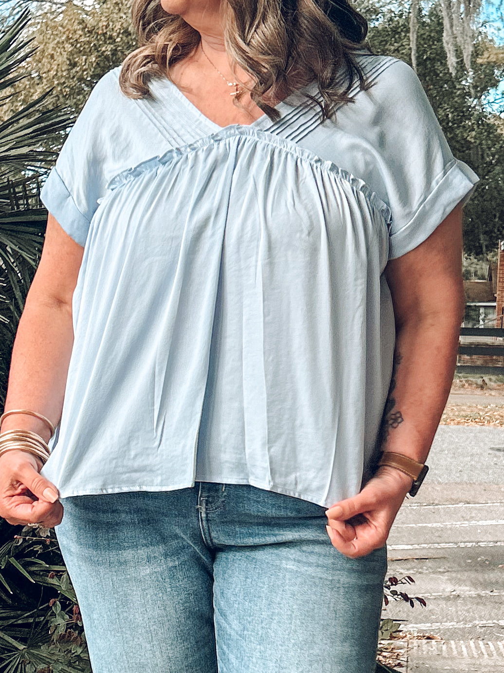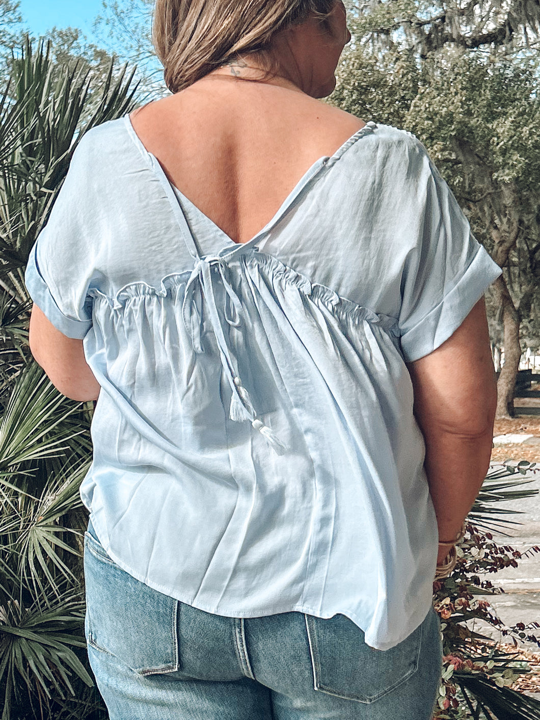 Elevate your wardrobe with this sophisticated babydoll blouse, crafted from luxurious satin woven fabric. Featuring flattering front and back V-necklines and relaxed dolman sleeves finished with cuff bands, this piece offers effortless elegance. The structured babydoll yoke creates a refined silhouette, while the straight hemline keeps the look polished. A decorative back tie with tassel trim adds a charming finishing touch, making this blouse perfect for both casual outings and dressed-up occasions.