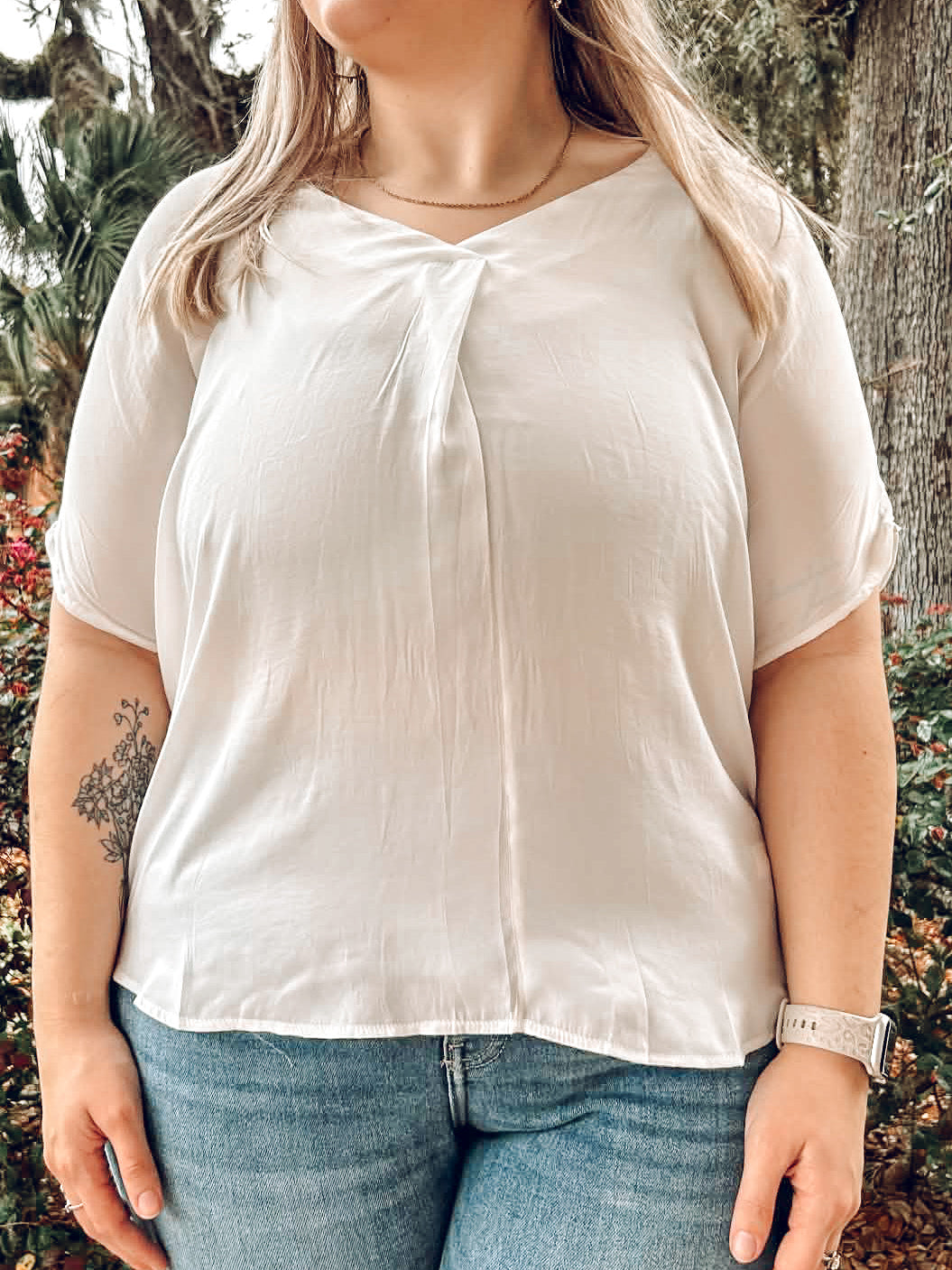 Effortless elegance meets comfort in this satin dolman top. The relaxed V-neckline and flowing short sleeves create a flattering silhouette perfect for layering or wearing solo. Crafted in smooth satin, this versatile white blouse transitions seamlessly from casual days to evening occasions. A wardrobe essential that pairs beautifully with denim, trousers, or skirts.