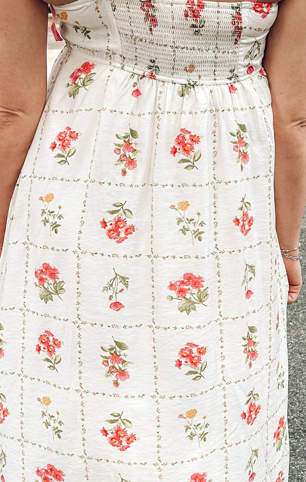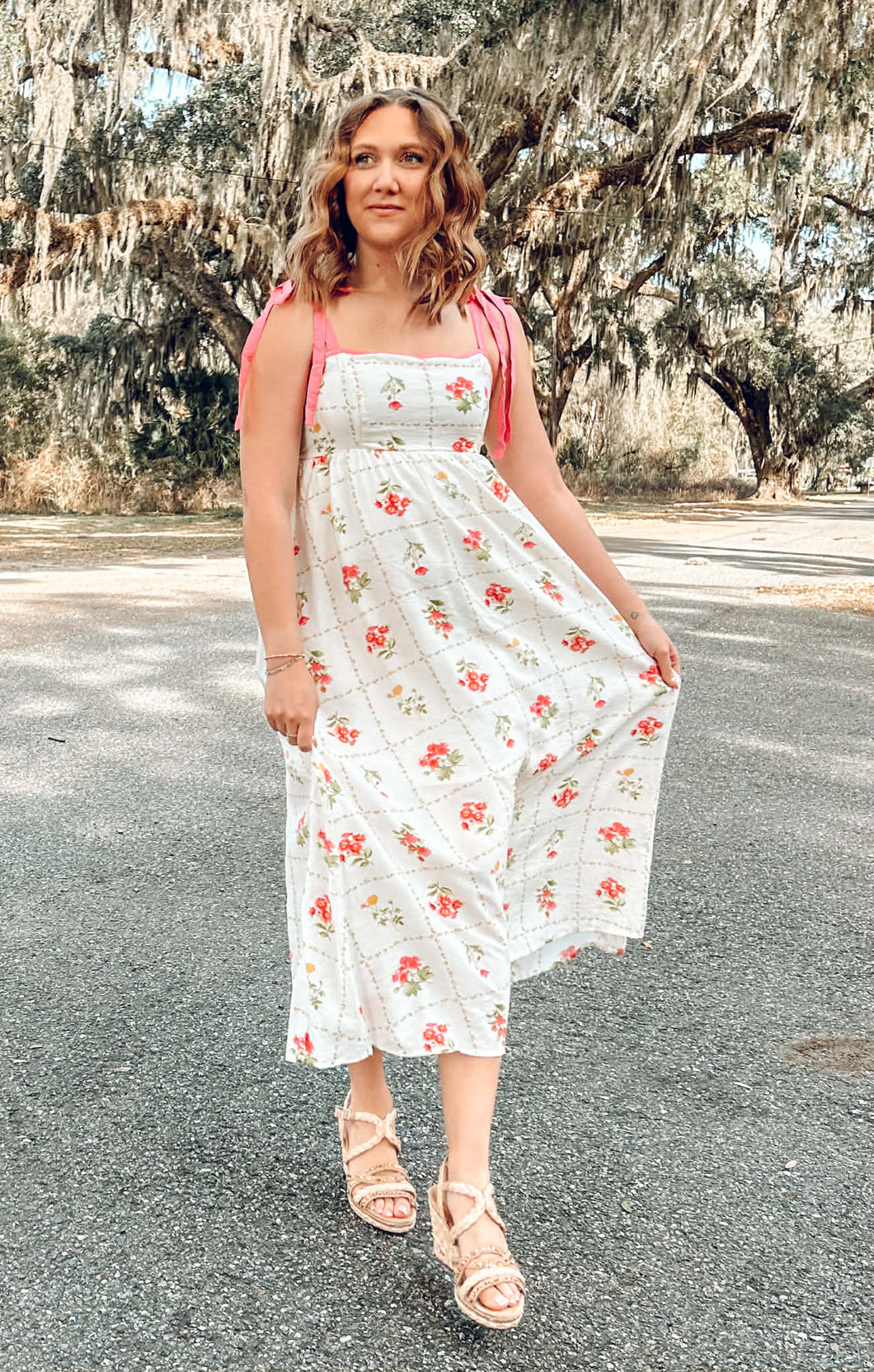 Elegant midi dress featuring a charming scallop neckline and delicate spaghetti straps with adjustable tie details. The empire waist flatters your silhouette while back smocking adds subtle texture and movement. Adorned with a beautiful floral tile pattern and finished with contrast trim throughout. Fully lined for comfort and confidence. Crafted from a breathable rayon-nylon blend shell with polyester lining for all-day wear.