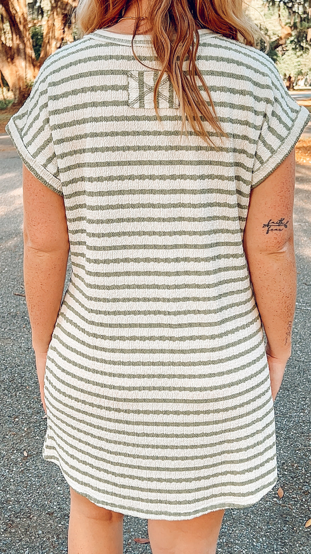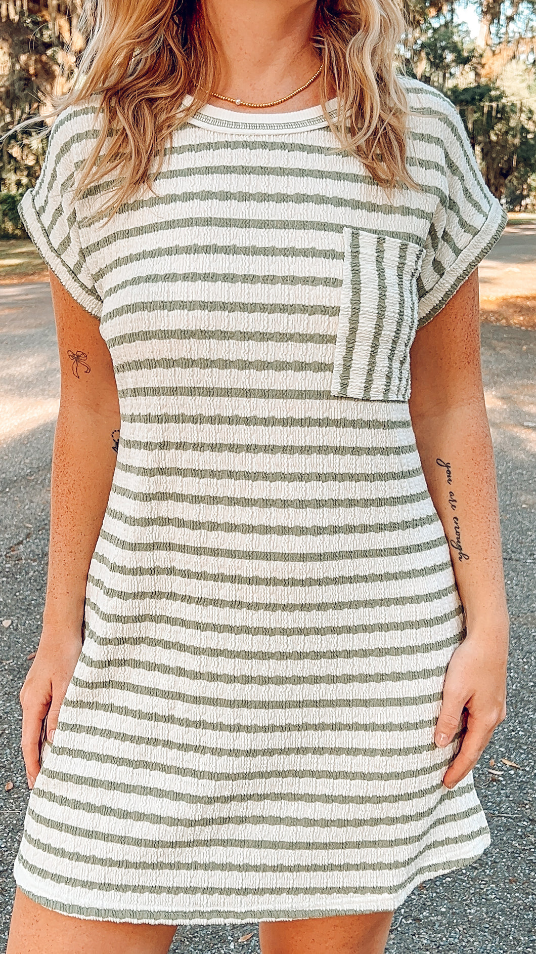 Round neckline, short sleeves with cute cuffed details, and functional pockets make this textured striped dress an absolute must-have. The relaxed fit and mini length are perfect for effortless, adorable everyday style. Textured knit pattern adds dimension and charm to this cozy-chic piece.