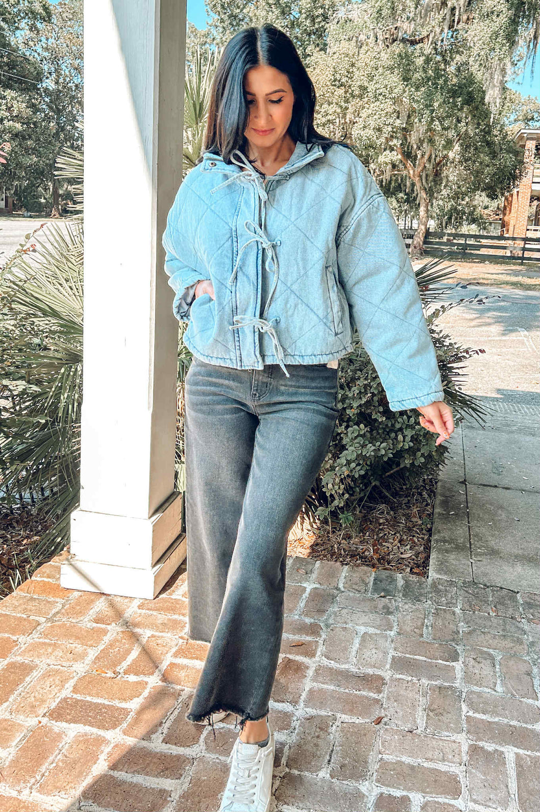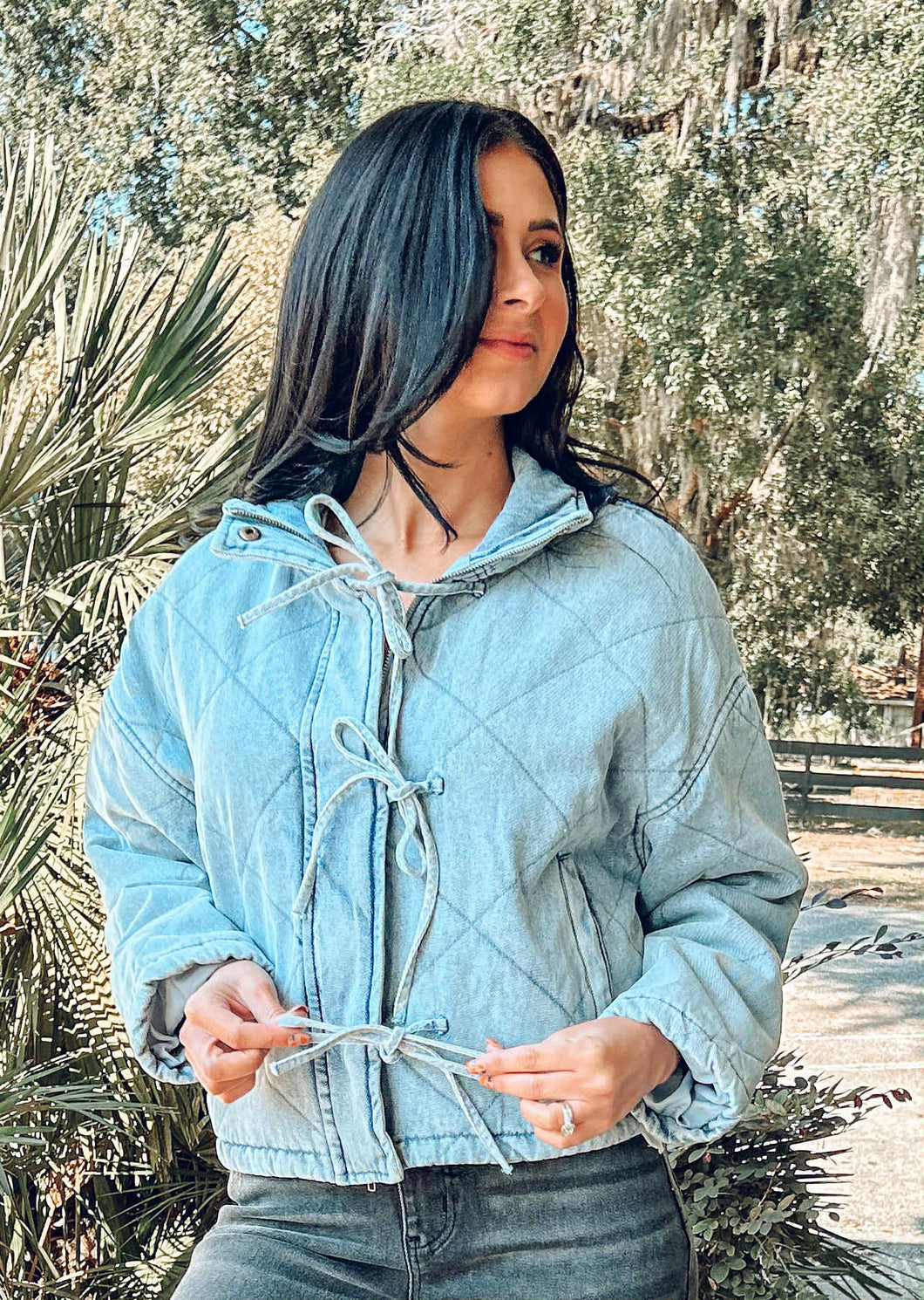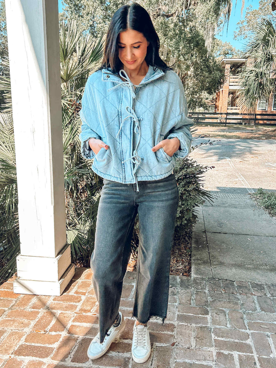 Elevate your outerwear with the Washed Quilted Tie Jacket in Light Denim. Featuring a flattering mock neckline and cozy long sleeves, this jacket combines style and comfort. The diamond quilted pattern with snap button details and front tie strap adds a modern touch, while elastic hem and practical pockets enhance fit and function. Crafted from 100% cotton shell with polyester lining and filling, it offers warmth without bulk. The acid wash tones give each piece a unique look you'll love, making this puffer jacket a versatile essential for your wardrobe.