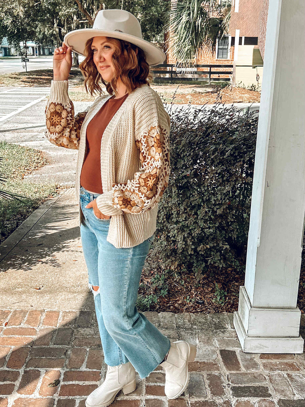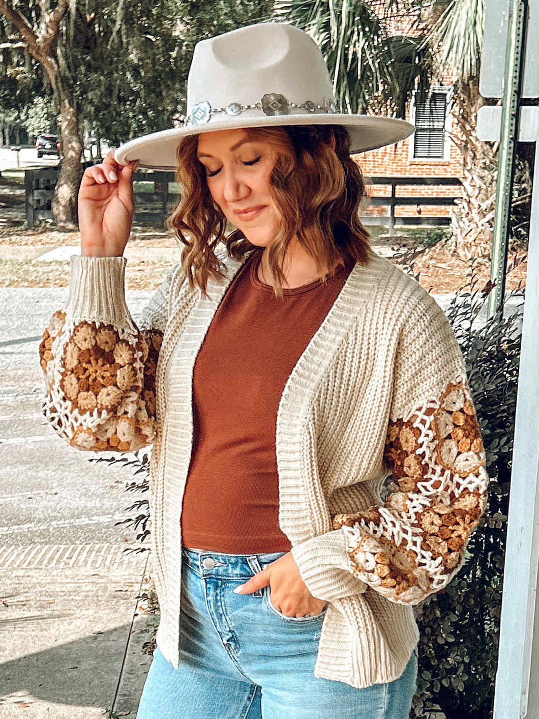Stay effortlessly stylish and cozy with the Carter Crochet Cardigan in Beige. Crafted from 100% polyester, its delicate crochet design pairs beautifully with trendy puff sleeves for a flattering silhouette. The open front makes layering simple, while the soft sweater knit ensures warmth and comfort throughout your day. Perfect for adding a touch of charm to any outfit, this cardigan blends fashion and function seamlessly.