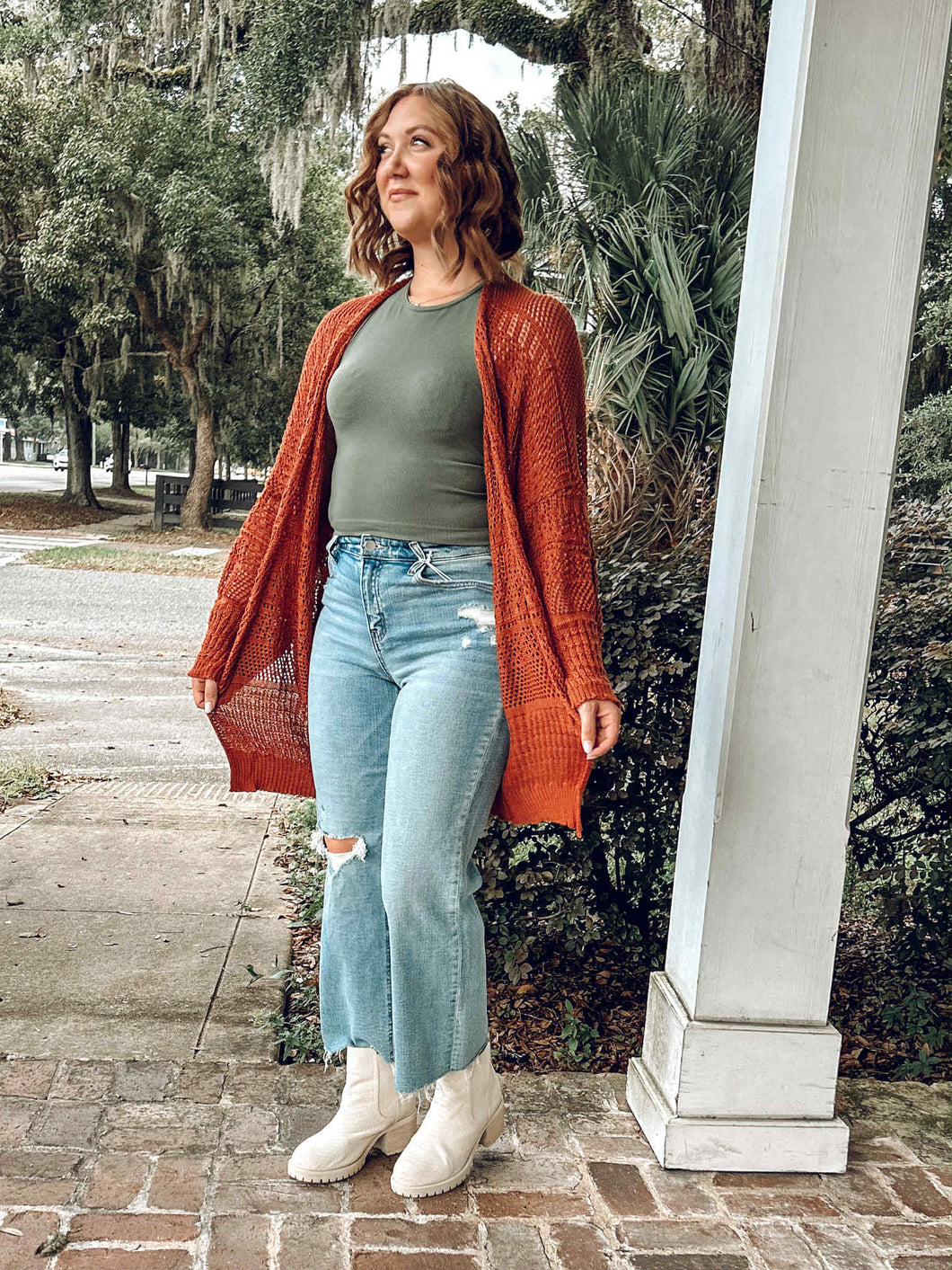 Elevate your layering game with our Relaxed Knit Cardigan in Warm Rust. Its open-front, netted design offers effortless style and comfort, perfect for any season. Whether draped over a dress or paired with your favorite jeans, this soft, relaxed-fit cardigan adds a touch of casual elegance to every look. A versatile wardrobe essential that transitions smoothly from day to night.