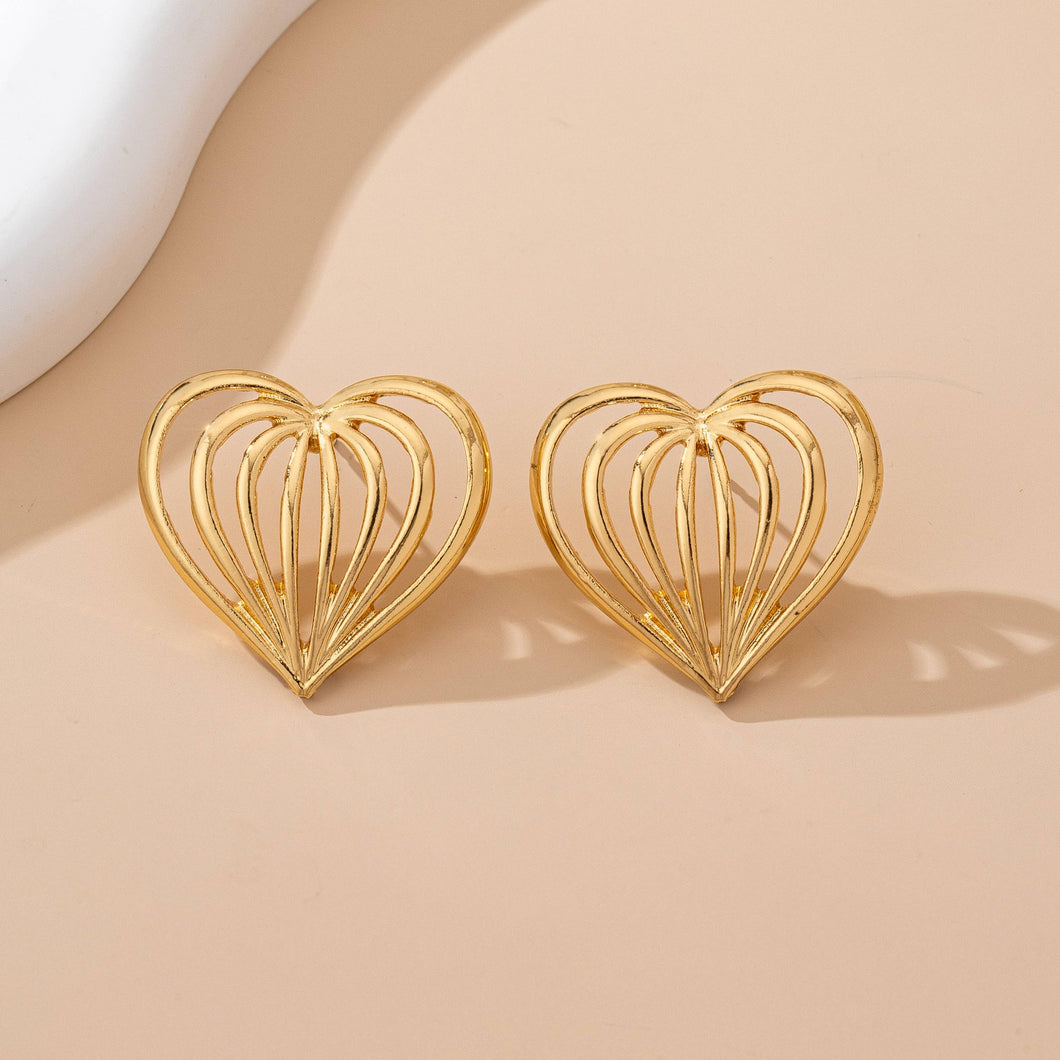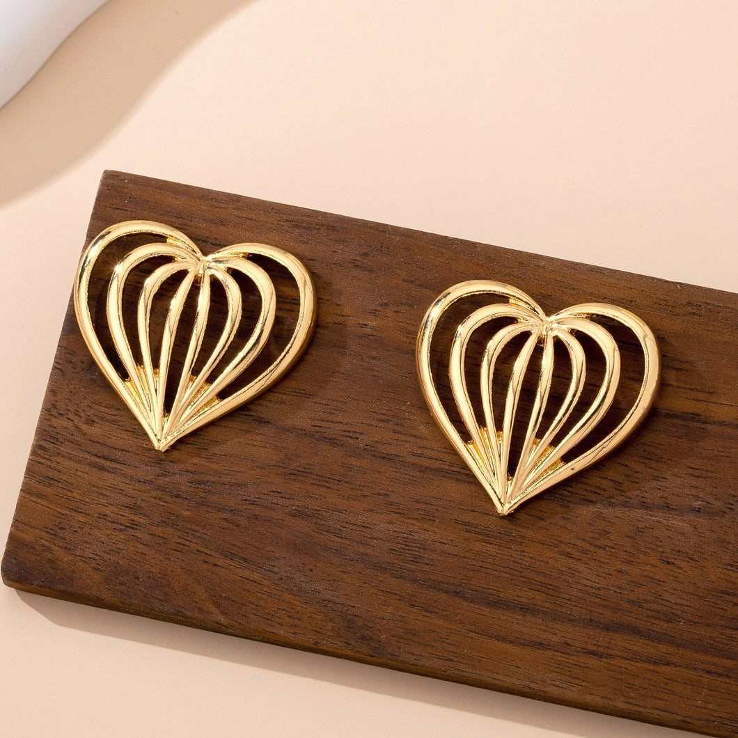 Bold gold-tone heart-shaped stud earrings with open ribbed design for sculptural, romantic statement style. Perfect gift for the holidays, including Christmas, Mother's Day, Valentine's Day, Easter.