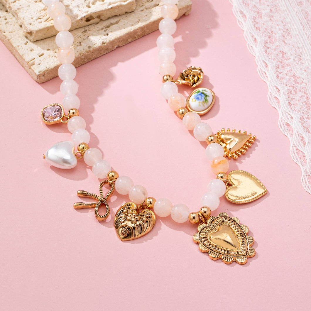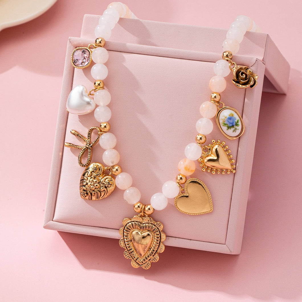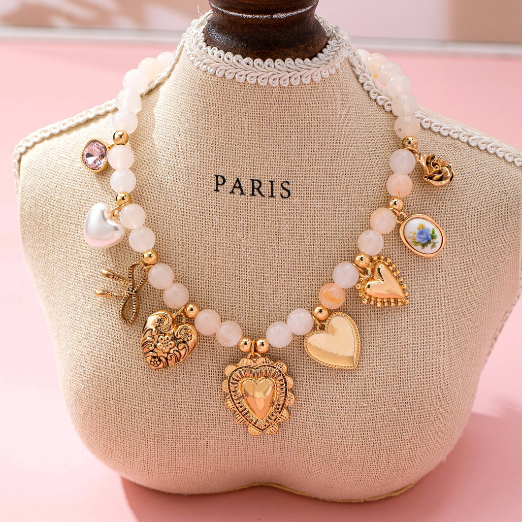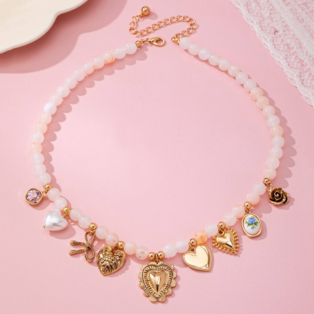 White beaded necklace with gold-tone spacers and seven eclectic charms: purple gem, pearl, scissors, floral heart, cameo oval, textured heart, and ornate heart. Whimsical, layered statement piece with adjustable clasp. Product Details: length: 17" ext: 2" Ball Chain Ext clasp: Lobster Claw metal finish: Acrylic bead product: Lead & Nickel Compliant durability: Double E-coating