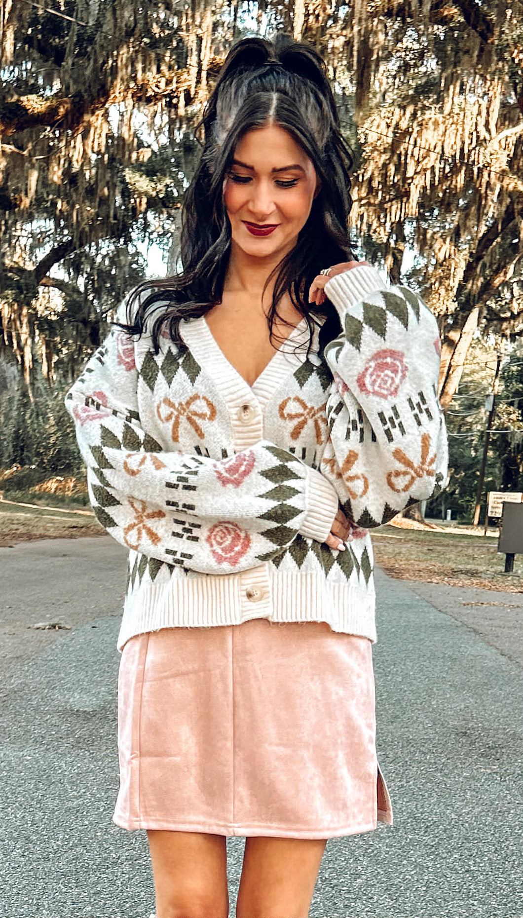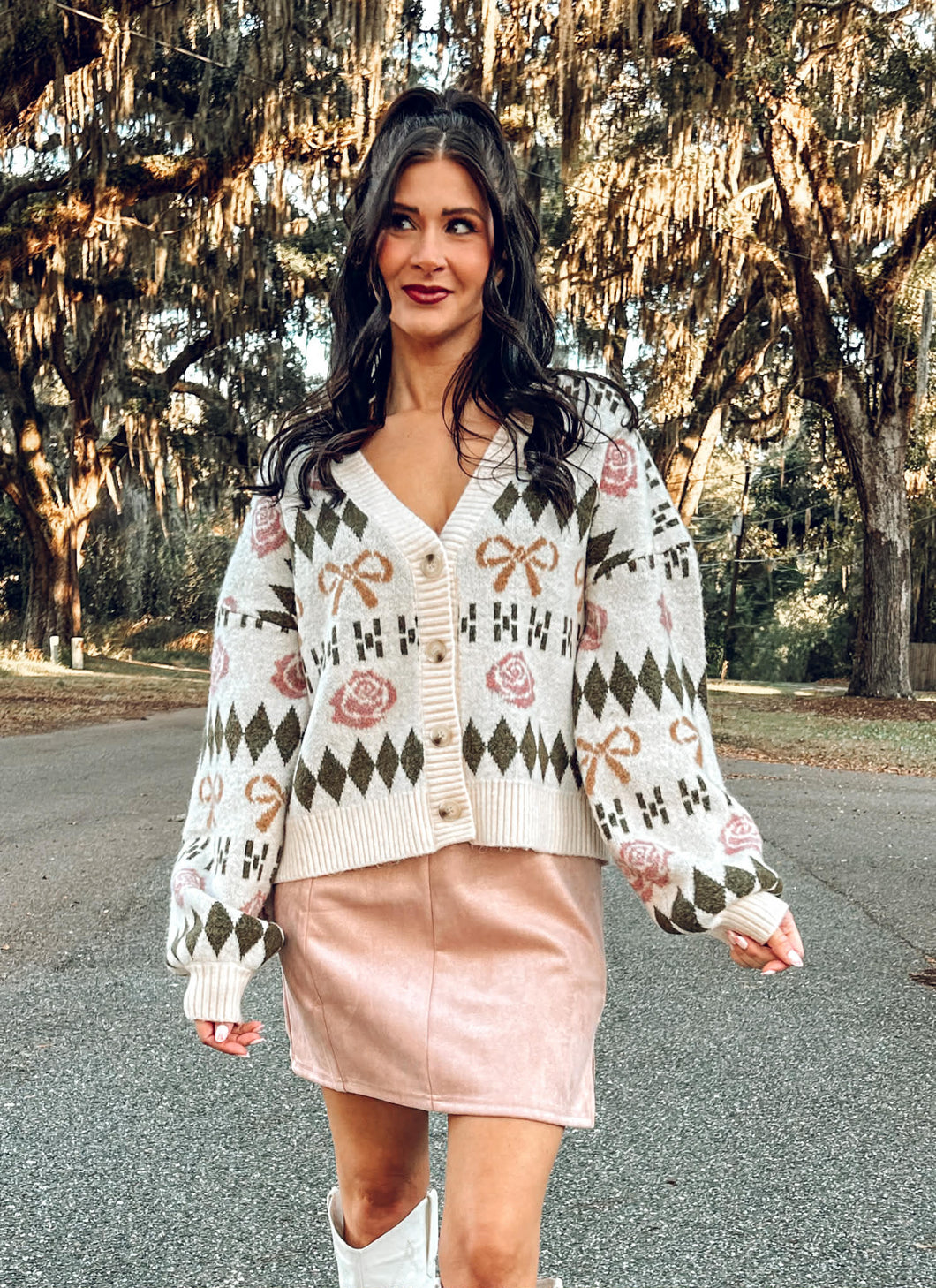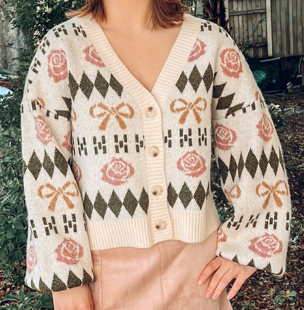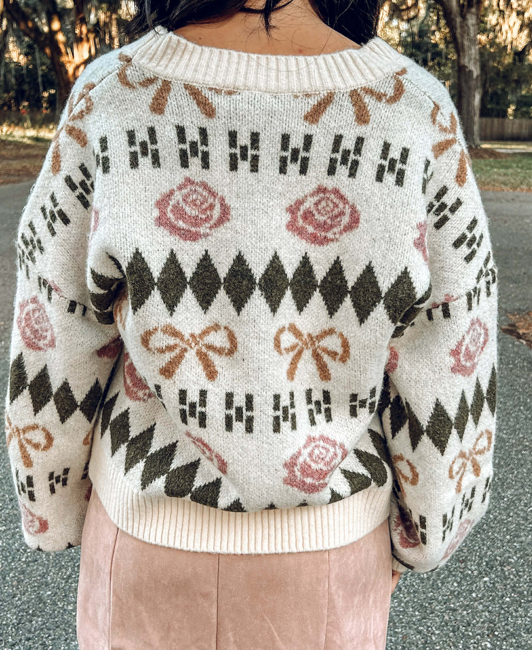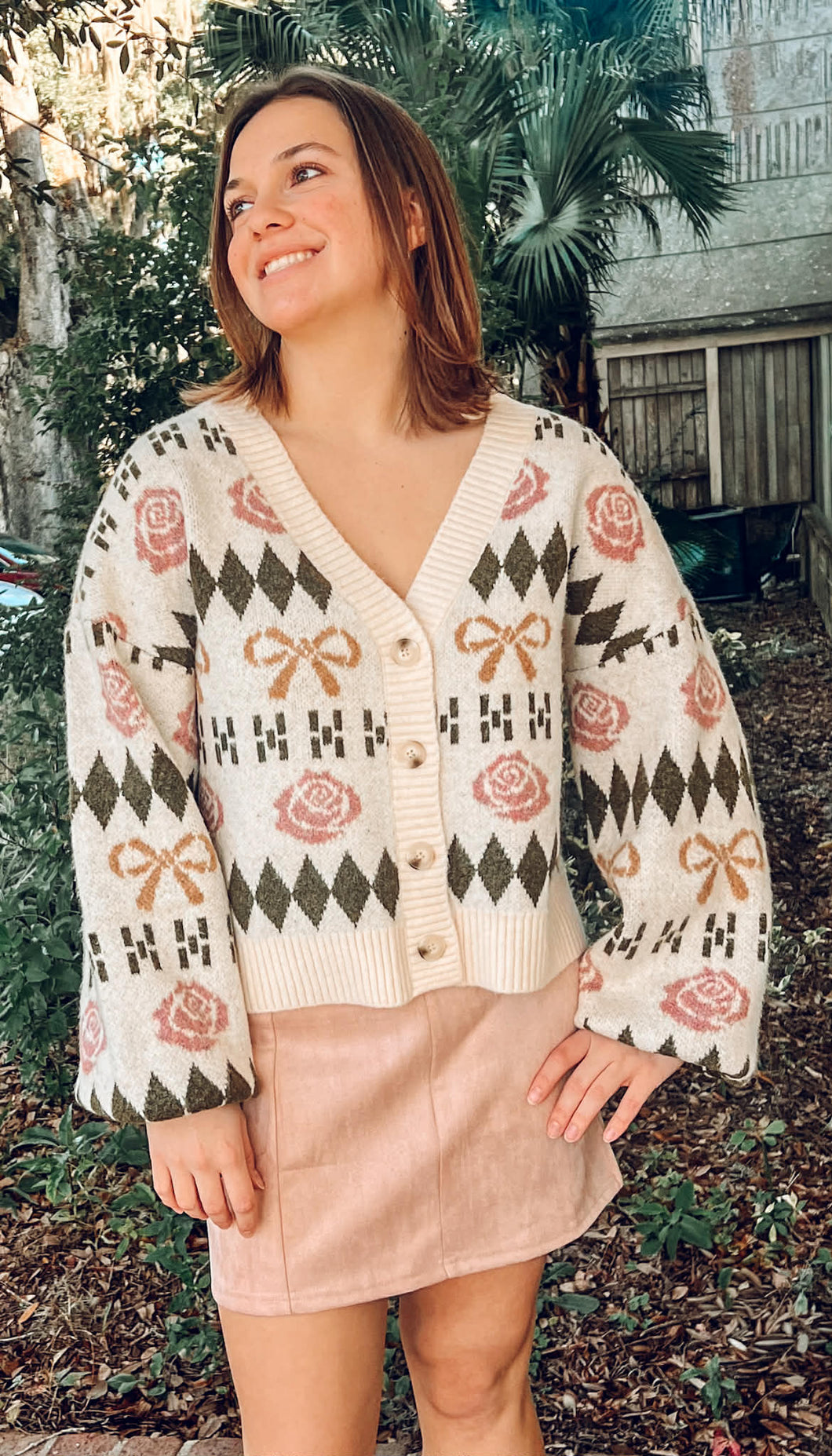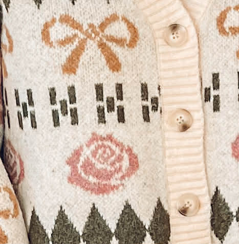Stay cozy and stylish with our Wrapped Floral Bow Cardigan. This oversized knit sweater features a beautiful bow and floral graphic design, perfect for adding a touch of charm to any outfit. The button-down closure, drop shoulder, and ribbed hem provide both comfort and convenience. Ideal for Christmas or any winter occasion.
