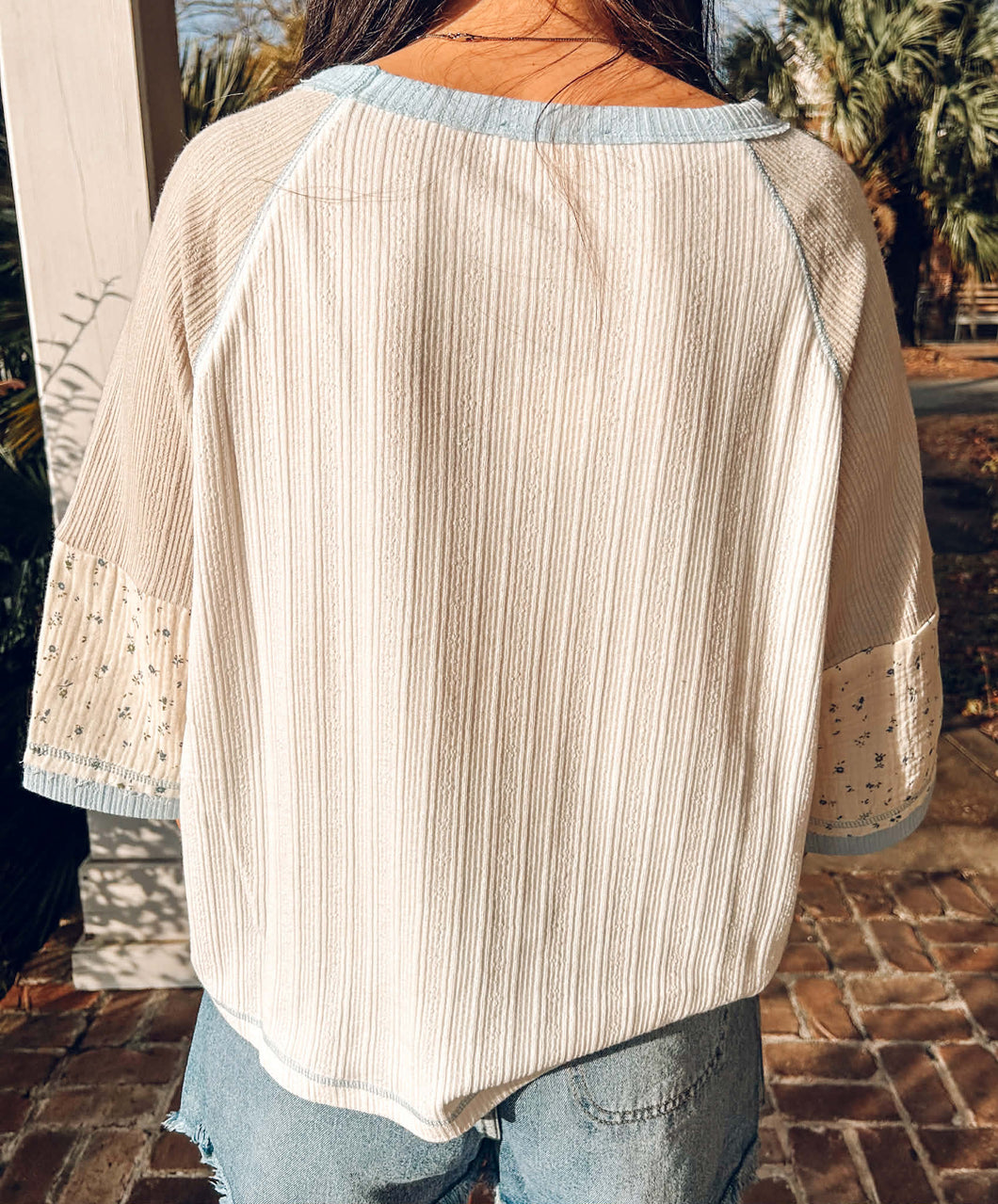 Layer up with personality in this mixed-fabric raglan top, where contrasting sleeves meet a fun print design. The single chest pocket adds practical style, while the relaxed raglan cut keeps things comfy and effortless. Perfect for casual days when you want a little visual interest without trying too hard. Pair it with your favorite jeans or dress it up with a skirt for instant versatility.