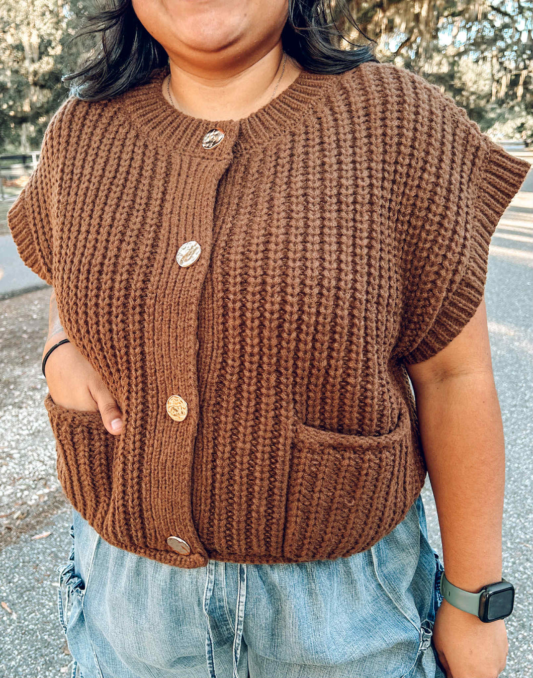 Embrace effortless style with this Oversize Button Down Vest in Brown. Featuring a relaxed fit, round neck, and convenient front pockets, it adds easygoing charm to any outfit. The short sleeves and ribbed hem provide comfortable structure, making it perfect for layering or wearing alone. Elevate your wardrobe with this versatile piece designed for all-day comfort and classic appeal.