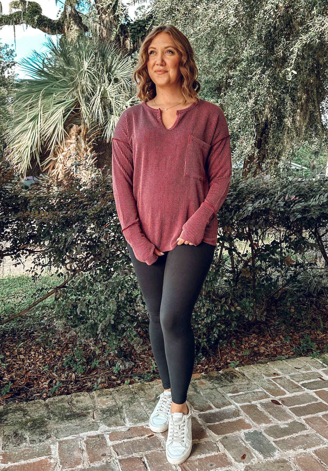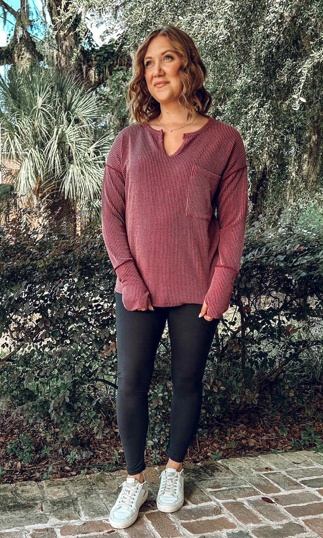 This ribbed knit pullover in rich burgundy combines comfort and style effortlessly. Featuring a notched neck and a handy chest pocket, it offers a relaxed fit with a modern drop shoulder and exposed seams for subtle edge. Long sleeves with thumbholes and a curved hem enhance both warmth and movement, making it your go-to cozy top for any occasion.
