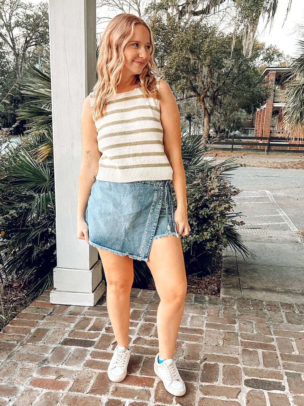 Effortless layering meets laid-back style with this sleeveless striped knit sweater in soft light olive. The back tie detail adds a flirty twist that works solo over a tee or layered under your favorite jacket. Crafted from a cozy knit blend, it's the perfect piece to elevate your everyday rotation without trying too hard. Versatile, comfortable, and just the right amount of personality.