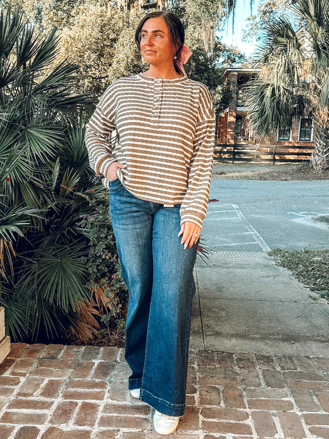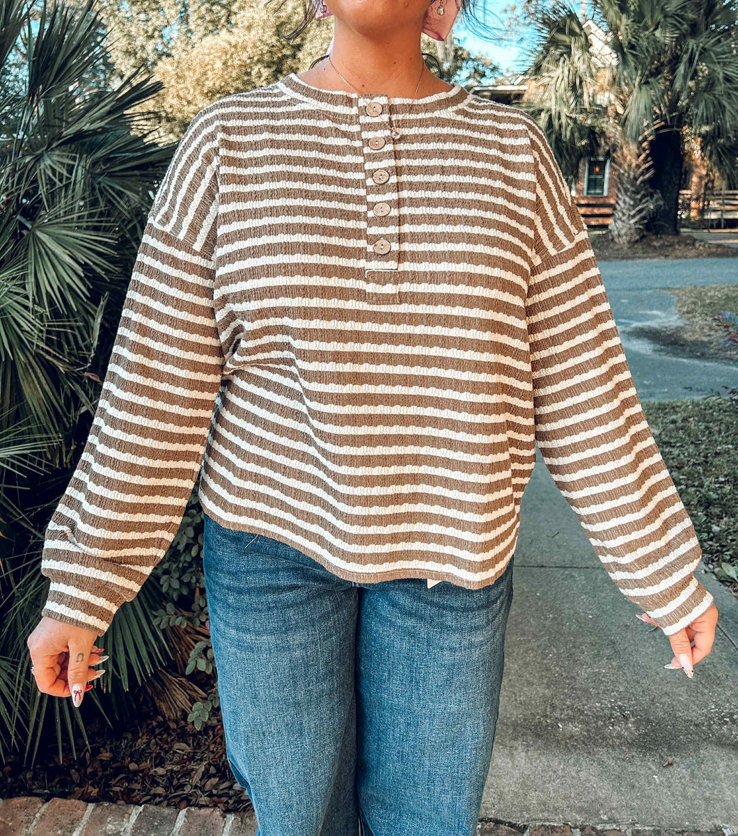Effortless comfort meets timeless style with this striped textured henley top. Crafted from a breathable cotton-blend fabric with just enough stretch, this relaxed-fit knit features a classic round neckline and half-button henley closure for versatile layering. Drop shoulders and long sleeves create an easy, modern silhouette that flatters every frame. The subtle stripe texture adds visual interest without overwhelming your wardrobe. Perfect for casual days or dressed-up weekends, this wardrobe essential transitions seamlessly from season to season.