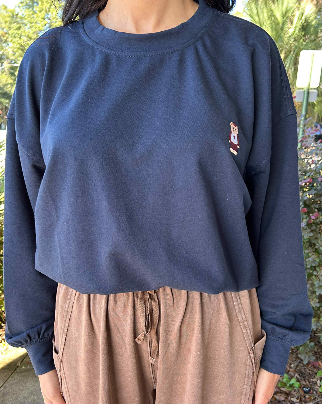 Cozy up in effortless style with this charming knit sweatshirt. Crafted from a breathable cotton-polyester blend, it features a relaxed silhouette with drop shoulders for that coveted laid-back vibe. The round neckline and long sleeves provide classic comfort, while an adorable teddy embroidery detail adds personality and warmth to your everyday wardrobe. Perfect for casual outings or relaxing at home, this versatile piece transitions seamlessly from season to season.