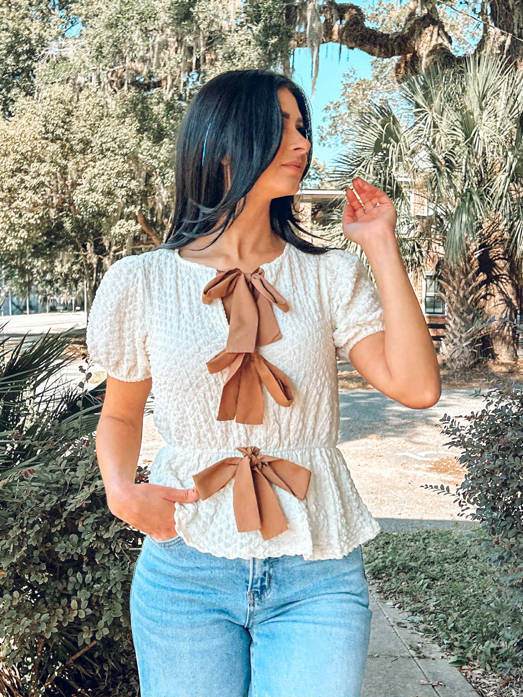 Elevate your wardrobe with the Tied With A Bow Top in cream. This knit top features a flattering round neckline and charming short puff sleeves for a feminine touch. The front bow tie and cut-out details add playful elegance, while the peplum hem enhances your silhouette. Crafted from a soft, stretchy blend with contrast accents and a cozy puffer knit pattern, it offers comfort and style. The elastic waistband ensures a perfect fit every time. Perfect for dressing up or layering, this top blends unique design with everyday ease.