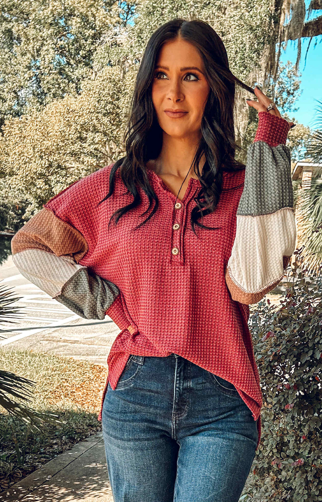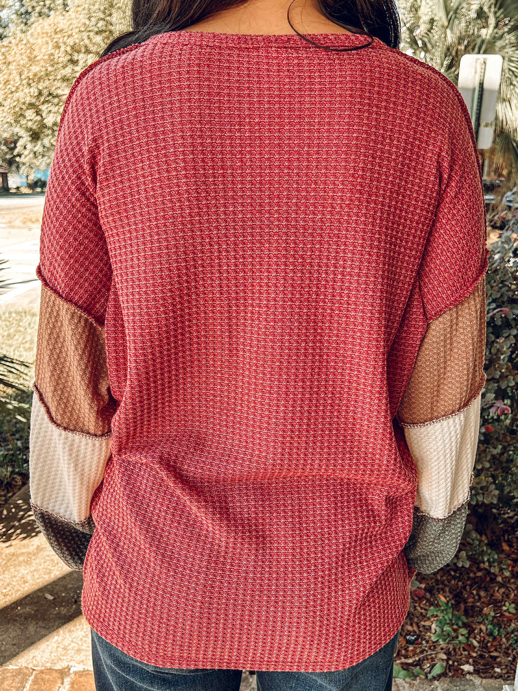 Effortlessly elevate your everyday wardrobe with this versatile striped knit sweater. The notched crew neckline and contrasting ribbed trim add refined detail, while drop shoulders and a relaxed silhouette deliver modern comfort. Long sleeves and a banded hem complete the polished look. Perfect for layering or wearing solo, this rust-toned piece transitions seamlessly from casual days to weekend outings.