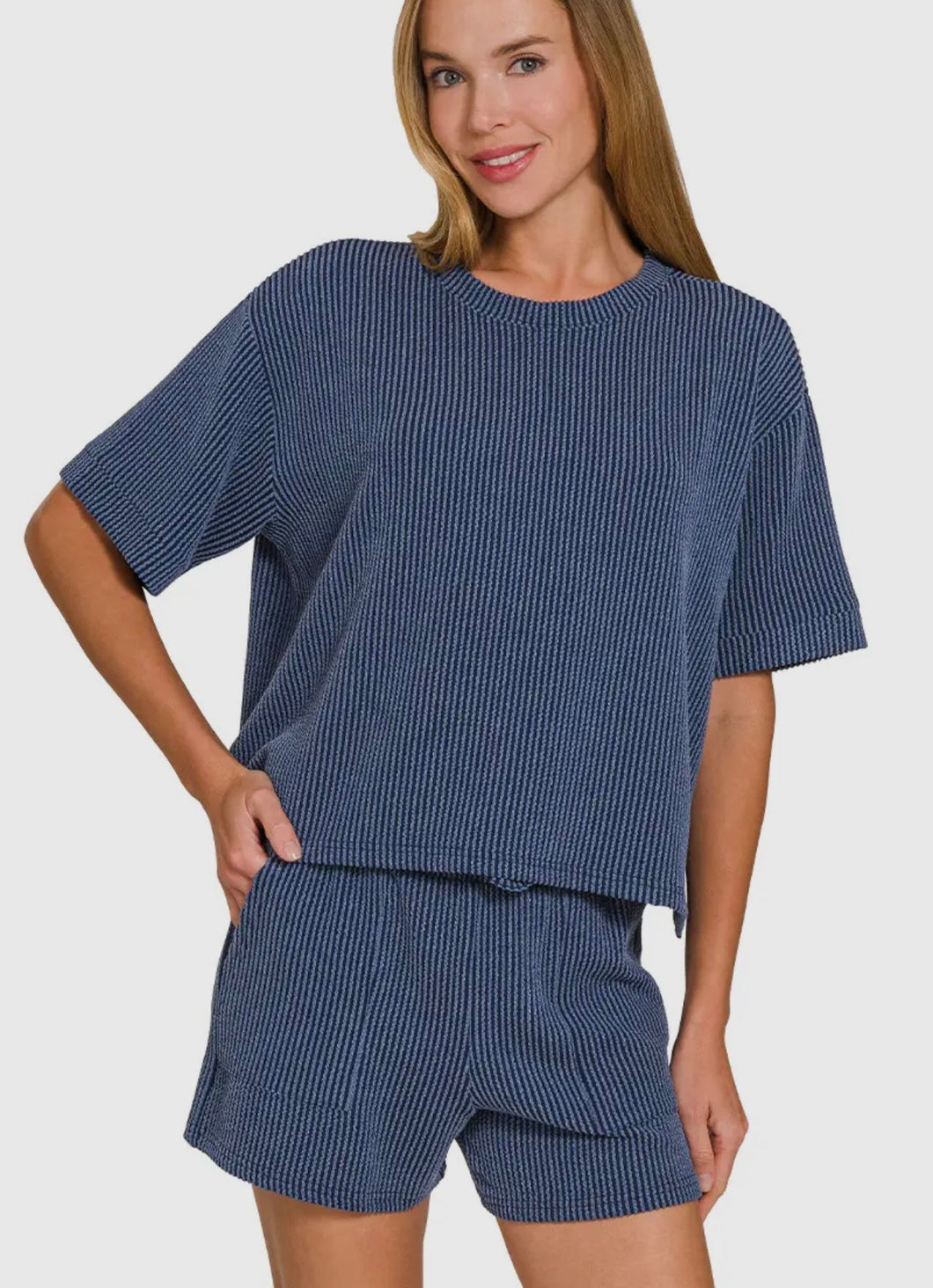 Effortless comfort meets laid-back style with this navy corded shorts set. The generous-fit round-neck tee pairs perfectly with functional shorts featuring a practical pocket—ideal for casual days when you want to look put-together without trying too hard. The breathable polyester-rayon blend with a touch of spandex keeps you comfortable and moves with you. Perfect for weekend hangs, errands, or just kicking back in style.