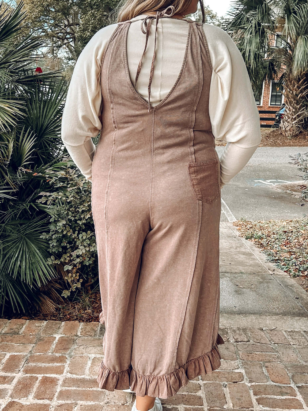 Effortlessly chic meets comfort in this mineral-washed cotton French terry jumper. The square neckline and sleeveless cut keep things breezy, while seam detailing adds visual interest throughout. A V-cut back with tie detail and functional side pockets make it as practical as it is stylish. The flared wide legs finish with a playful ruffle hem, creating movement with every step. Perfect for casual days that call for something a little extra.